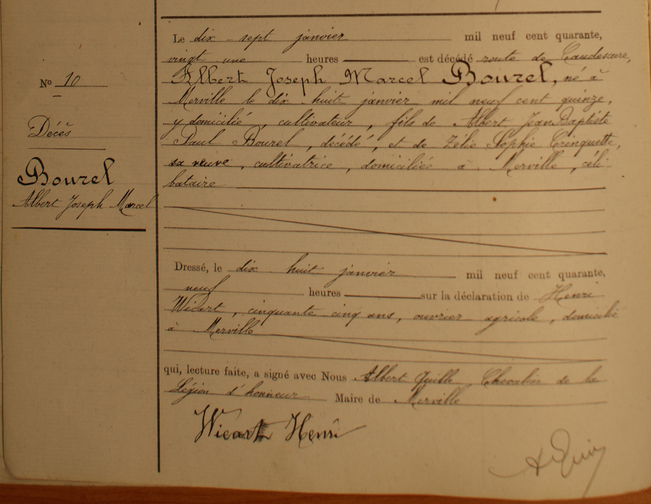 rue de CaudescureActe de naissance de Albert Joseph Marcel BOUREL Profession Cultivateur Décès Mercredi 17 jan 1940 Merville, 59660, Nord, Hauts-de-France, France Adresse: