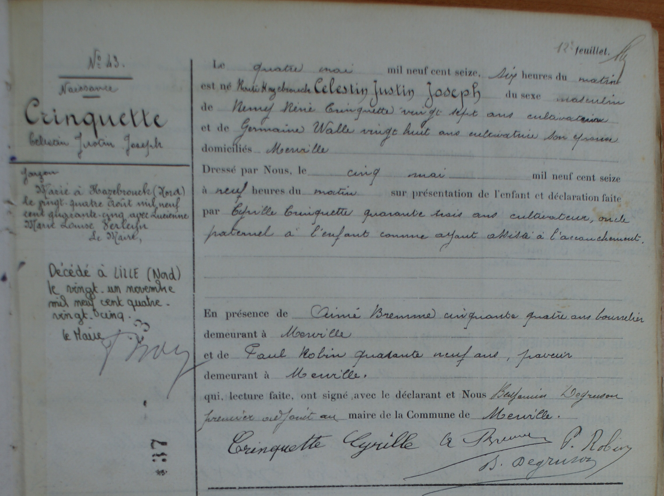 Acte de naissance de Célestin Justin Joseph CRINQUETTE DécèsJeudi 21 nov 1985 Lille, 59000, Nord, Hauts-de-France, France