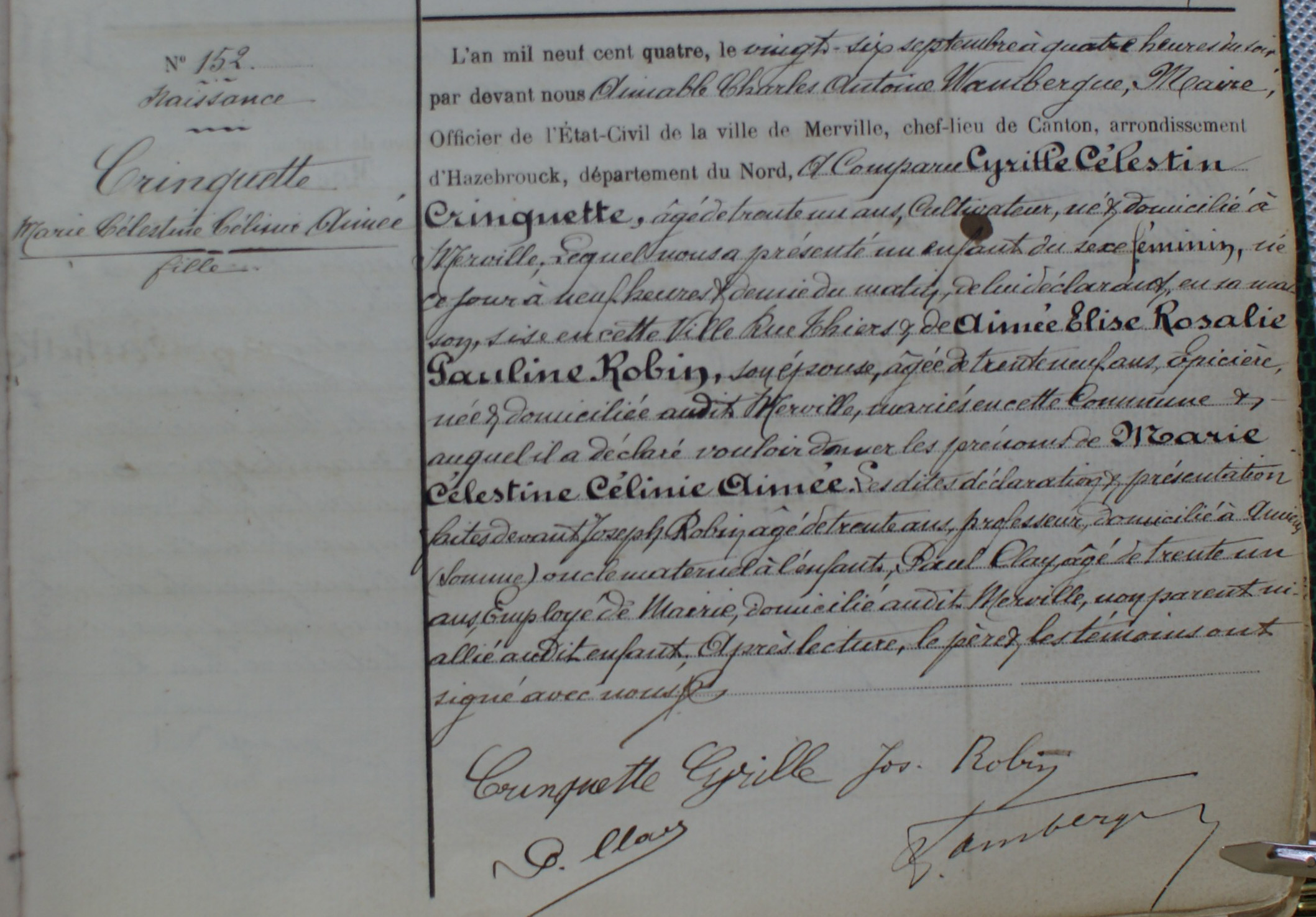 Acte de naissance de Marie Célestine Célinie Marie CRINQUETTE DécèsVendredi 18 déc 1914 Merville, 59660, Nord, Hauts-de-France, France