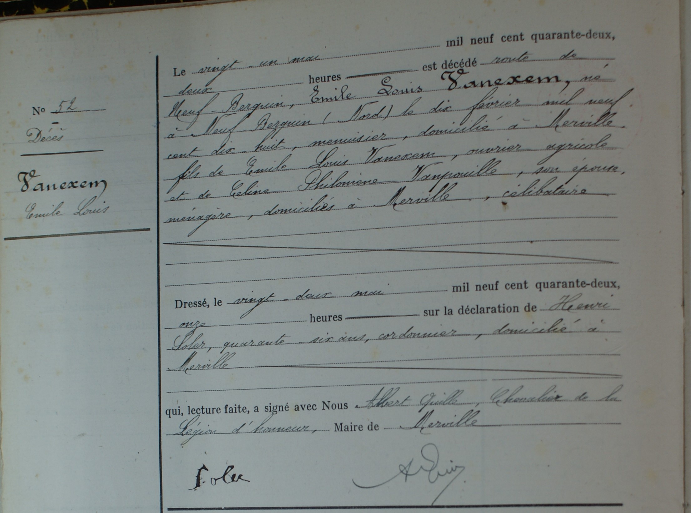 Acte de décès de Emile Louis VANEXEM InhumationMerville, 59660, Nord, Hauts-de-France, France