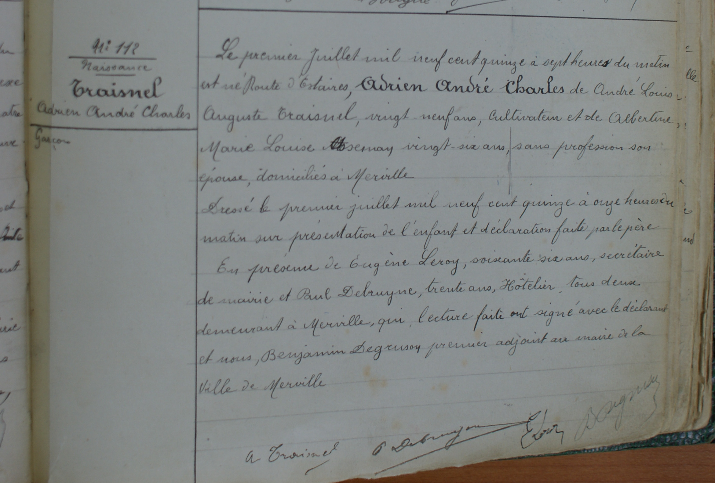 Acte de naissance de Adrien André Charles TRAISNEL Décèsoui, date inconnue Patriarche & Matriarche