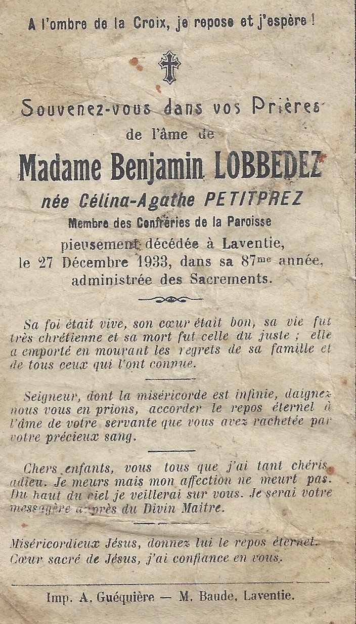 Carte souvenir de Celina Agathe LOBBEDEZ-PETITPREZ Patriarche & Matriarche