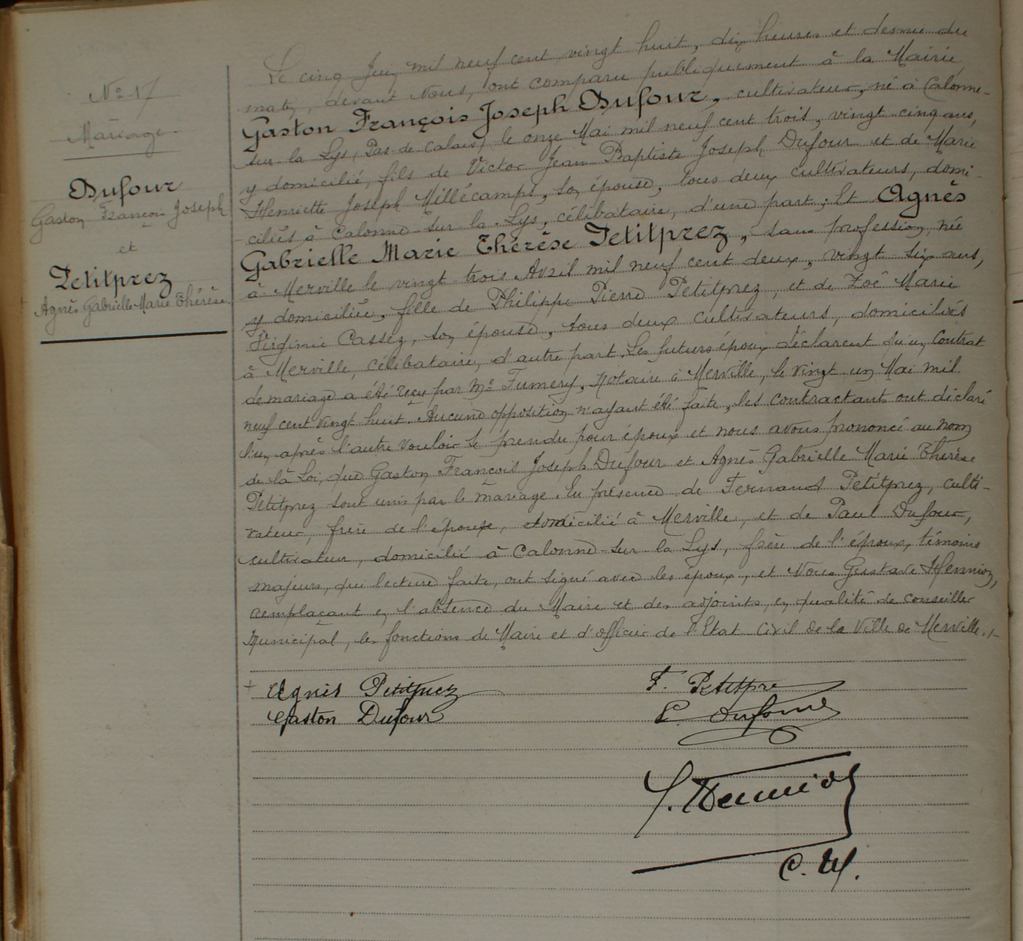 Acte de mariage de Gaston François Joseph DUFOUR + Agnes Gabrielle Marie Thérèse PETITPREZ