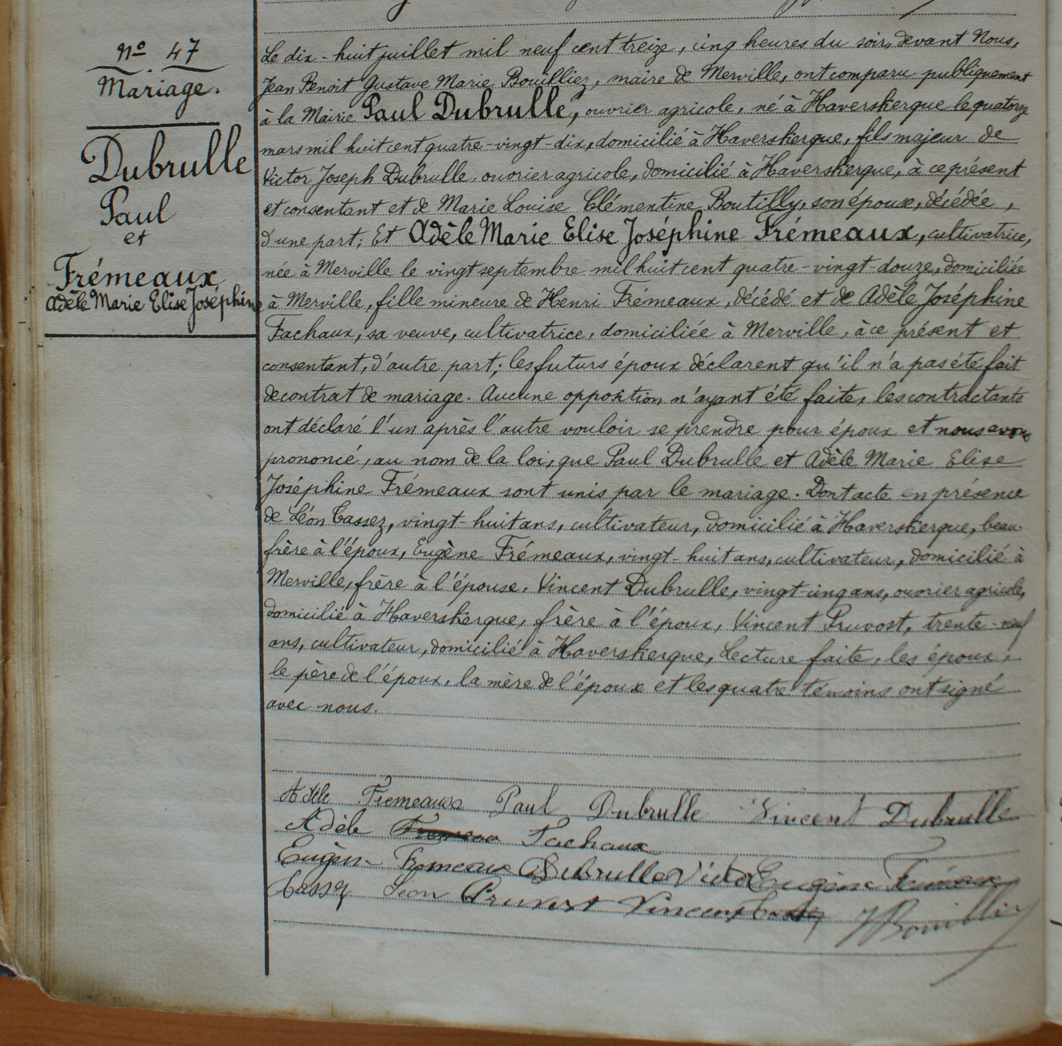 Famille: DUBRULLE Paul / FREMEAUX Adéle Marie Elise Joséphine (F010392)