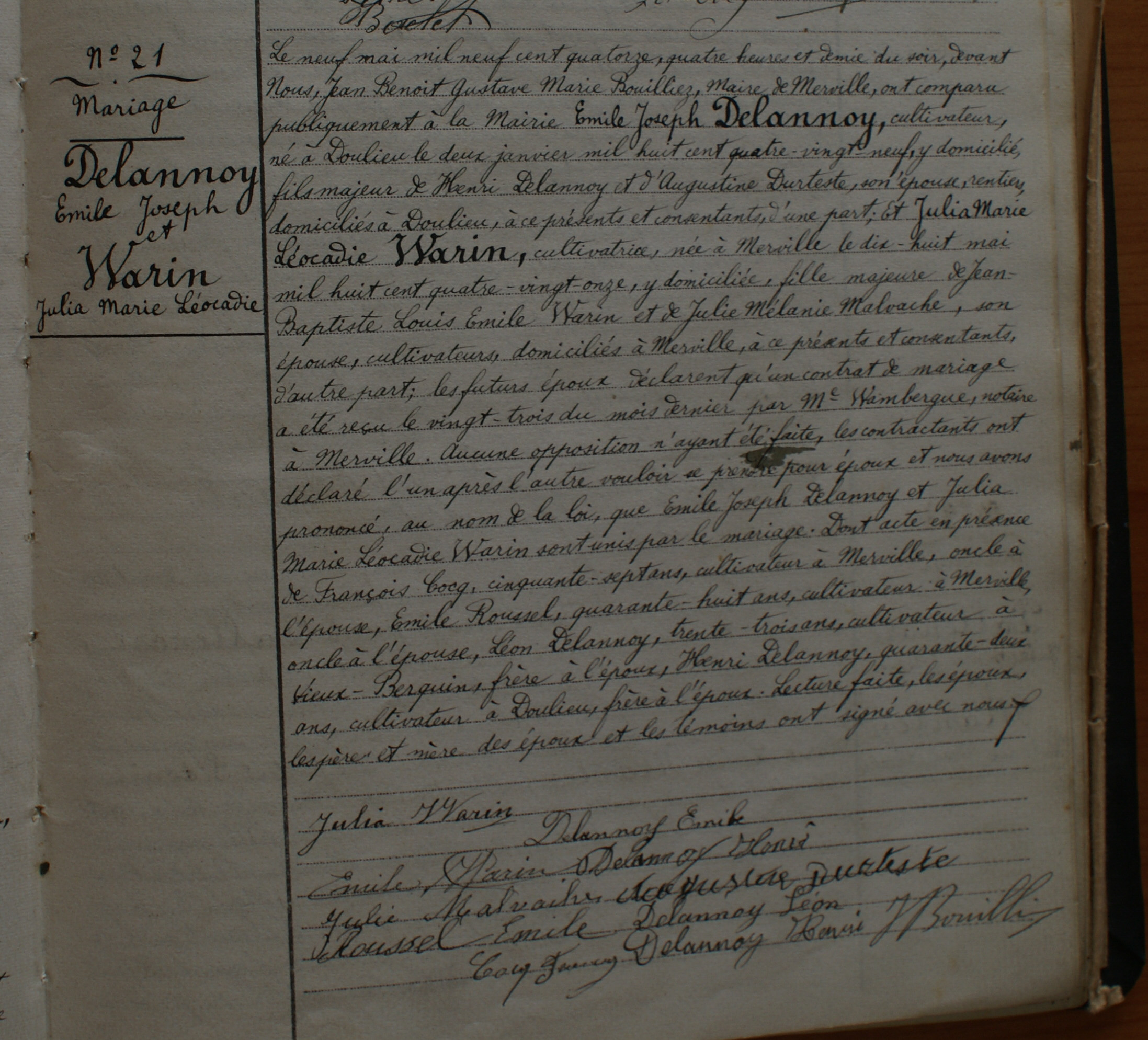 Acte de mariage de Emile Joseph DELANNOY + Julia Marie Leocadie WARIN Age au mariage Lui : 25 ans et 4 mois - Elle : 23 ans. Enfants 1. DELANNOY Henri, n. oui, date inconnue d. oui, date inconnue > 2. DELANNOY Jean Marie, n. oui, date inconnue d. oui, date inconnue + 3. DELANNOY Jeanne, n. oui, date inconnue d. oui, date inconnue 4. DELANNOY Marthe Jeanne Juliette, n. Mardi 23 sept 1919, Le Doulieu, 59940, Nord, Hauts-de-France, France