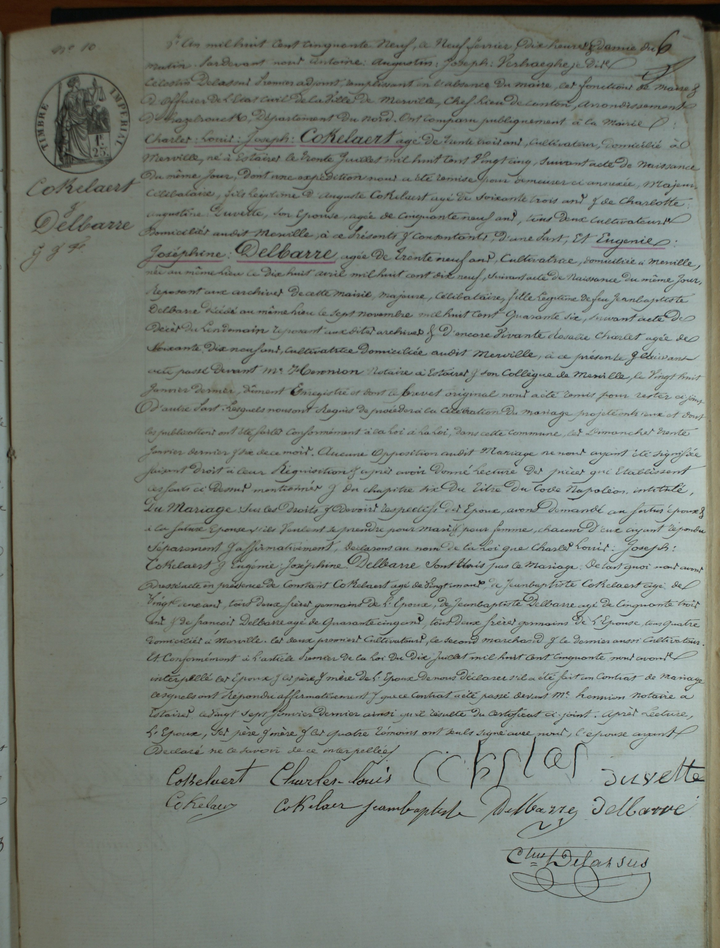 Acte de mariage de Charles Louis Joseph COKELAER + Eugénie Joséphine DELBARRE Age au mariage Elle : 39 ans et 10 mois - Lui : 33 ans et 7 mois. ID Famille F004406 Feuille familiale | Tableau familial