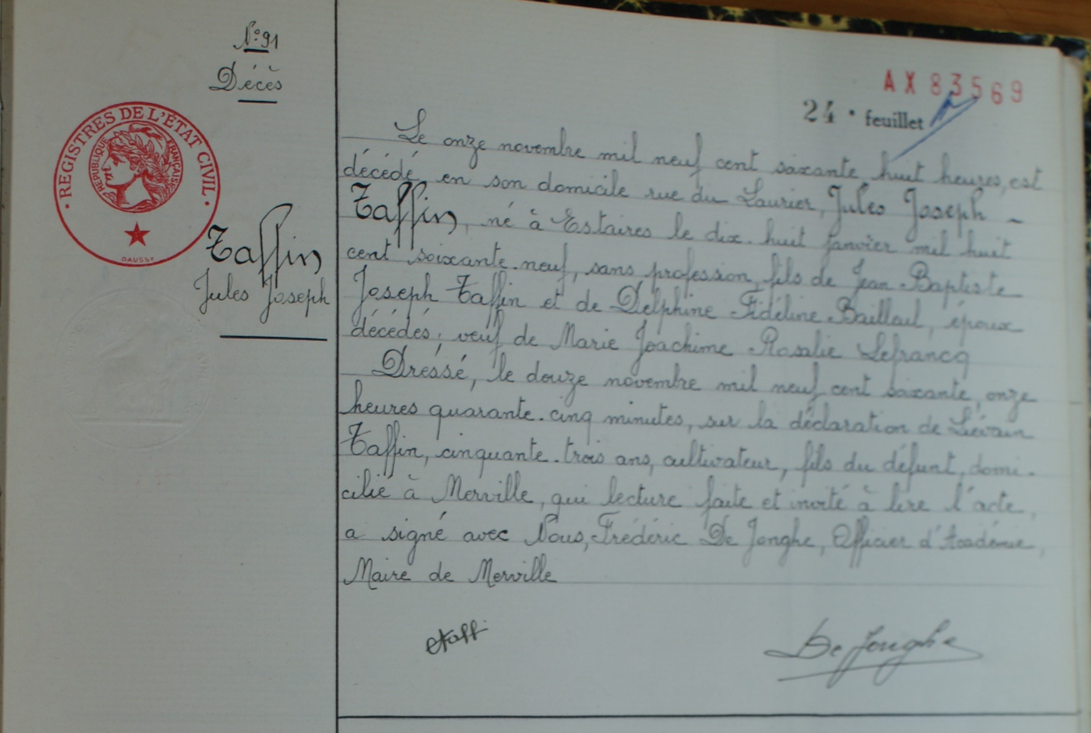 Acte de décès de Jules Joseph TAFFIN Patriarche & Matriarche