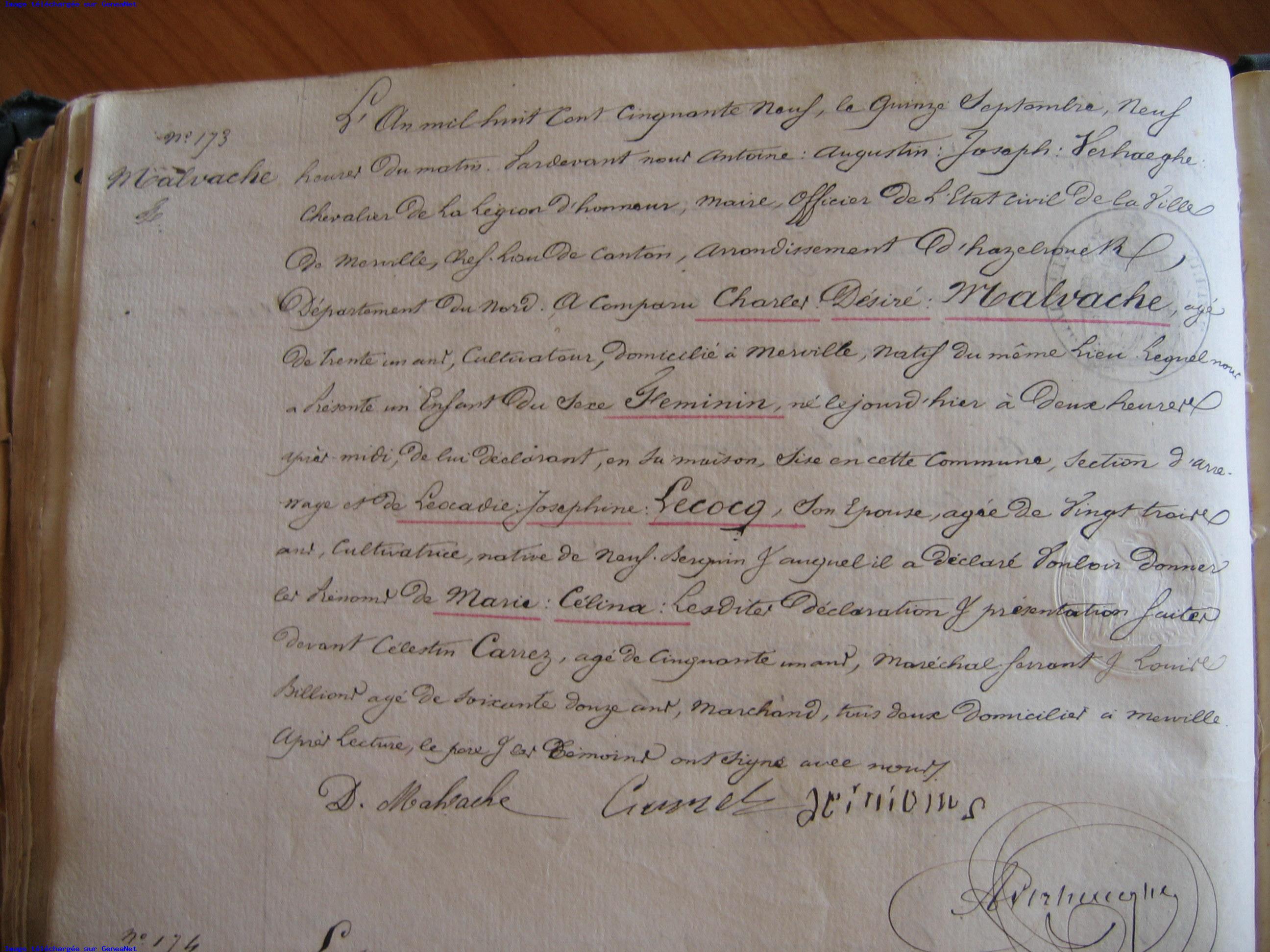 Acte de naissance MALVACHE Charles desire Profession Merville, 59660, Nord, Hauts-de-France, France