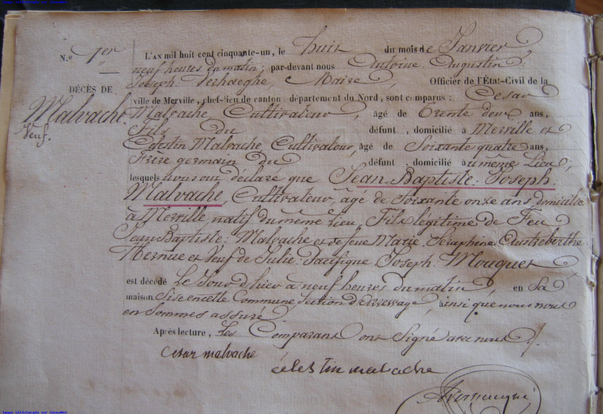 ▻ MOUQUET Julie Pacifique Joseph , m. Mercredi 26 jan 18142. MALVACHE Pierre Joseph Constant, n. Mardi 28 nov 1780, Merville, 59660, Nord, Hauts-de-France, France