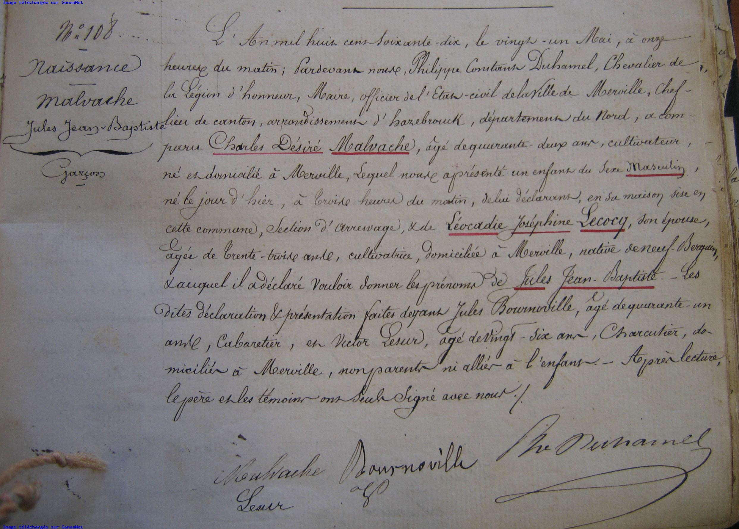 Frères et sœurs 7 frères et 5 sœurs + 1. MALVACHE Jean-Baptiste Desire, n. Mercredi 05 mai 1858, Merville, 59660, Nord, Hauts-de-France, France