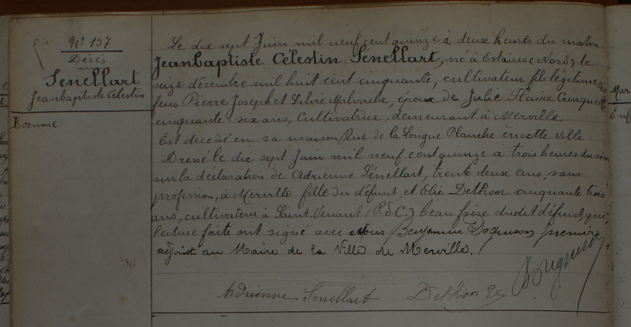 Acte de naissance de Jean Baptiste Celestin SENELLART Inhumation Merville, 59660, Nord, Hauts-de-France, France