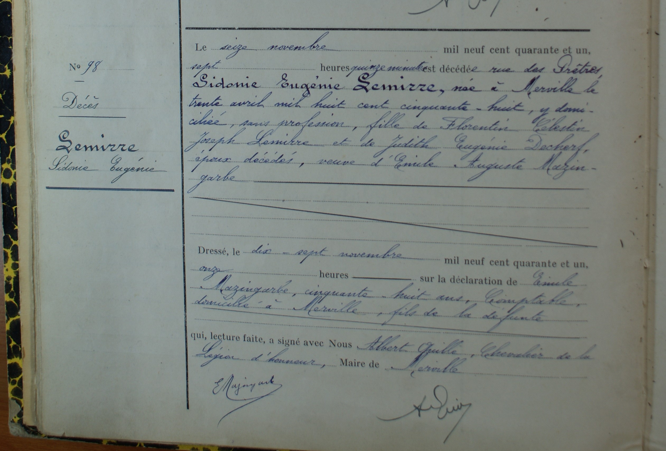 Acte de naissance de Sidonie Eugénie LEMIRE Profession Blanchisseuse Décès Dimanche 16 nov 1941 Merville, 59660, Nord, Hauts-de-France, France
