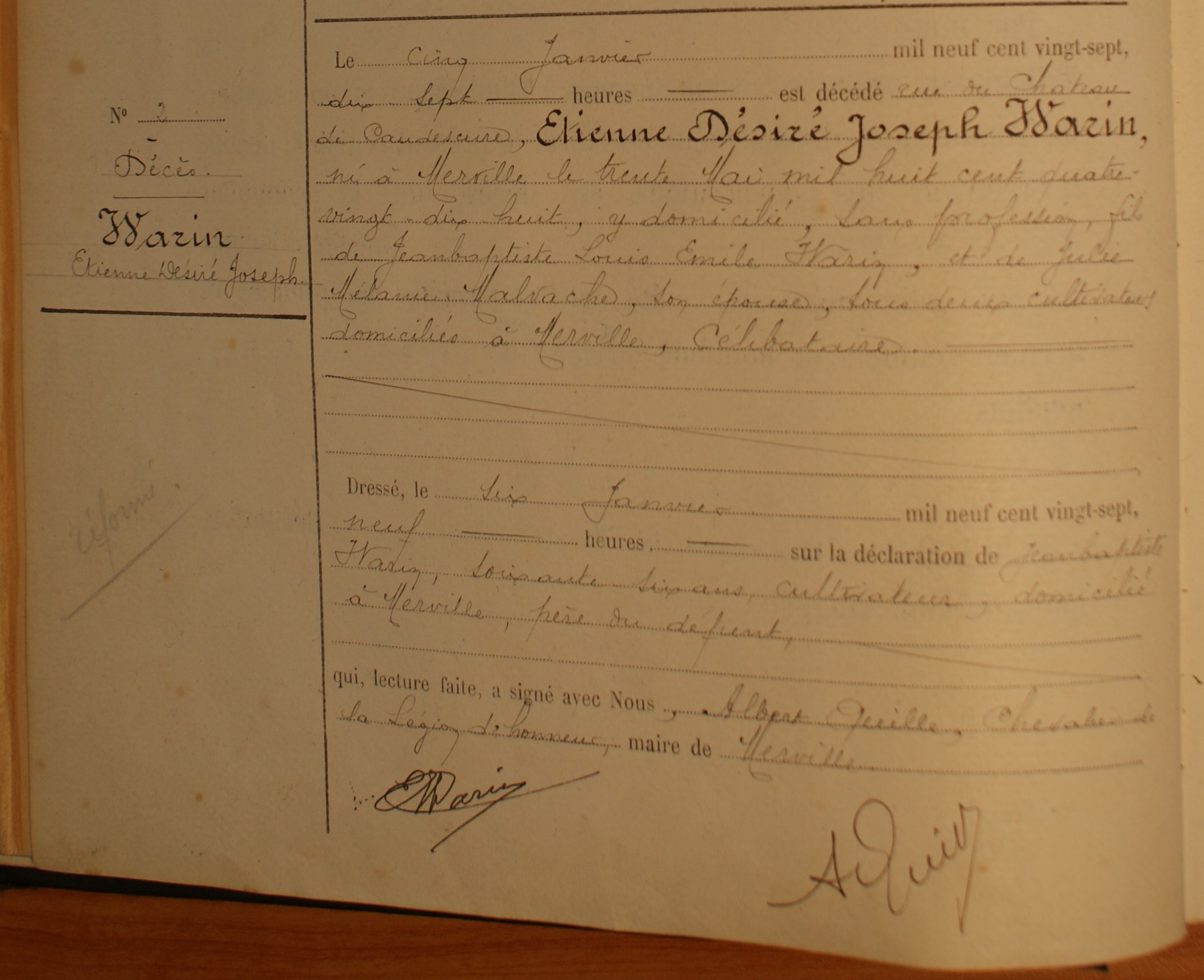 Acte de naissance de Etienne WARIN Décès Mercredi 05 jan 1927 Merville, 59660, Nord, Hauts-de-France, France