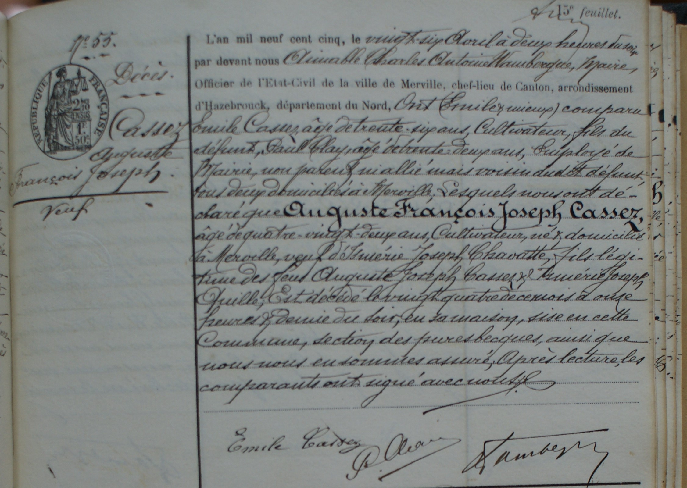 Acte de décès de Auguste François Joseph CASSEZ Patriarche & Matriarche
