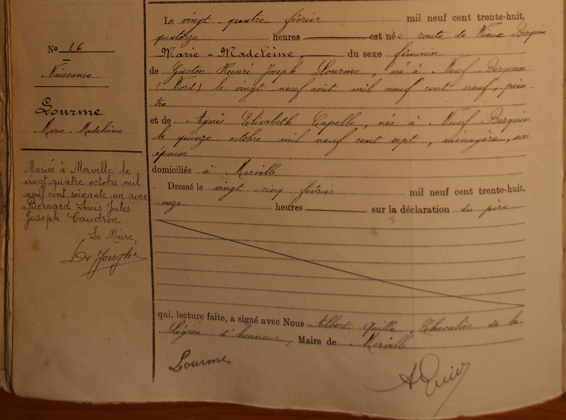 Acte de mariage de Bernard Louis Jules Joseph CAUDRON + Marie-Madeleine LOURME Age au mariageElle : 23 ans et 8 mois - Lui : 23 ans et 11 mois. ID FamilleF007770 Feuille familiale | Tableau familial Dernière modif.Dimanche 11 jan 2015