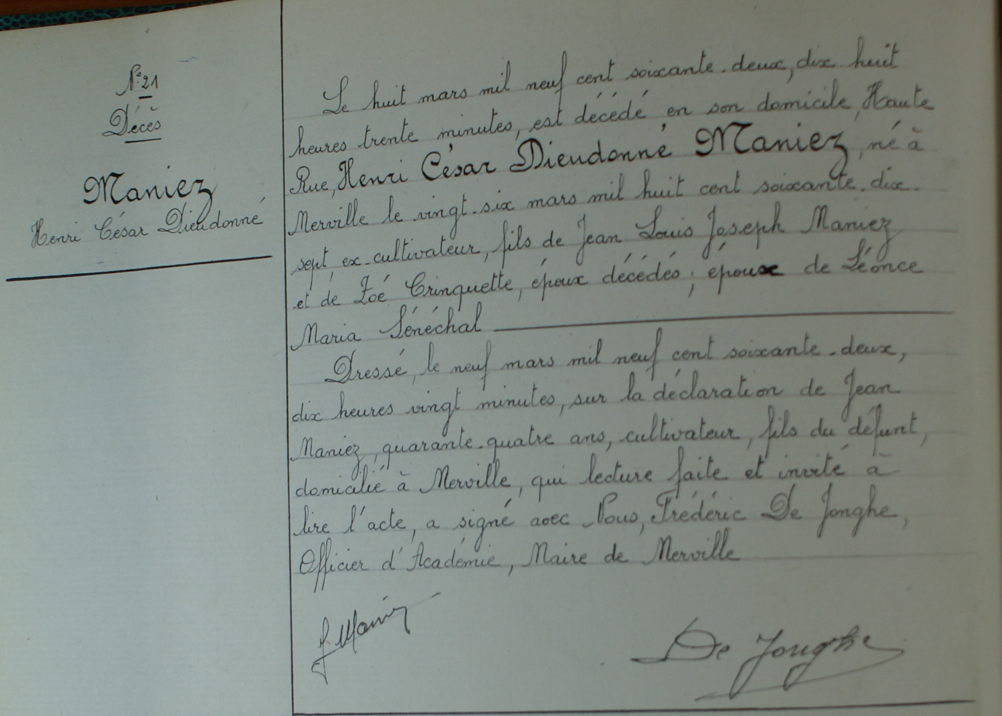 Acte de naissance de Henri César Dieudonné MANIEZ Profession Cultivateur Décès Jeudi 08 mars 1962 Merville, 59660, Nord, Hauts-de-France, France