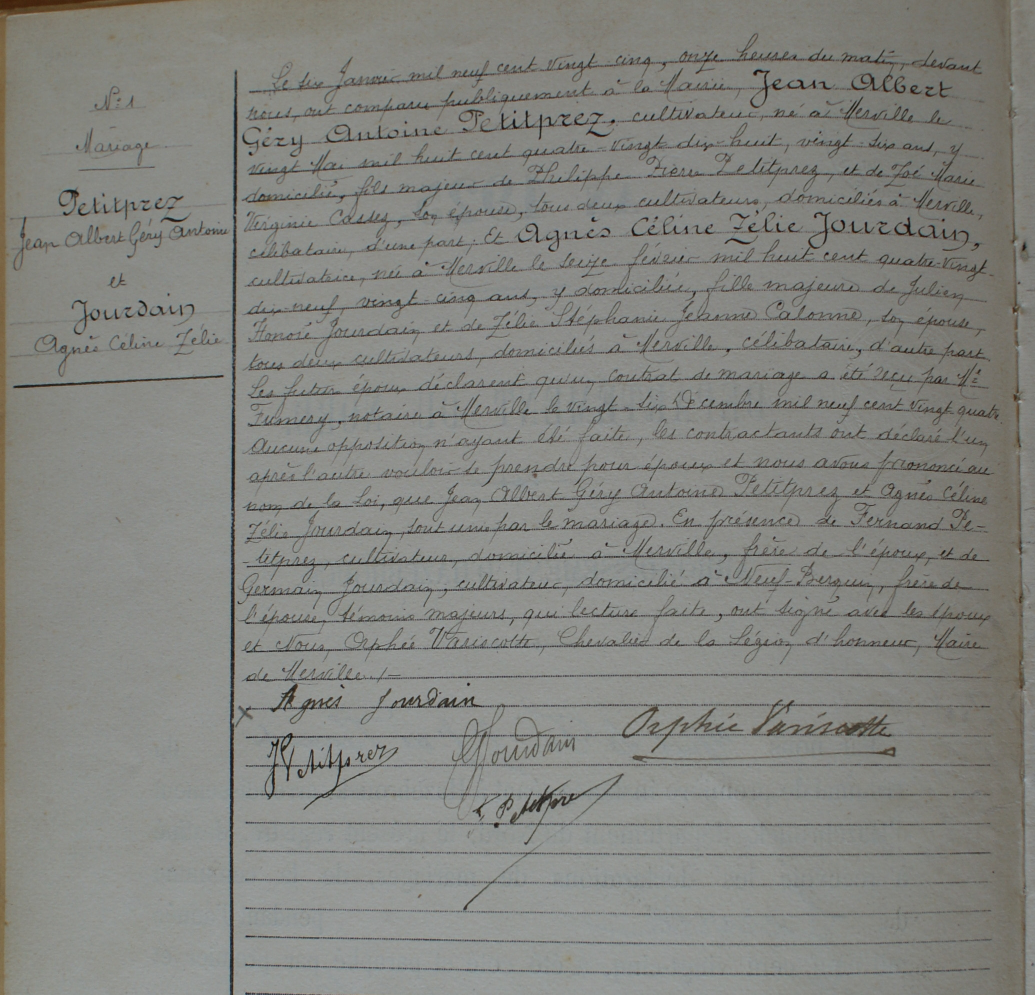 Acte de mariage de Jean Albert Gery Antoine PETITPREZ + Agnes Celine Zelie JOURDAIN Age au mariage Lui : 24 ans et 8 mois - Elle : 23 ans et 11 mois. ID Famille F000768 Feuille familiale | Tableau familial