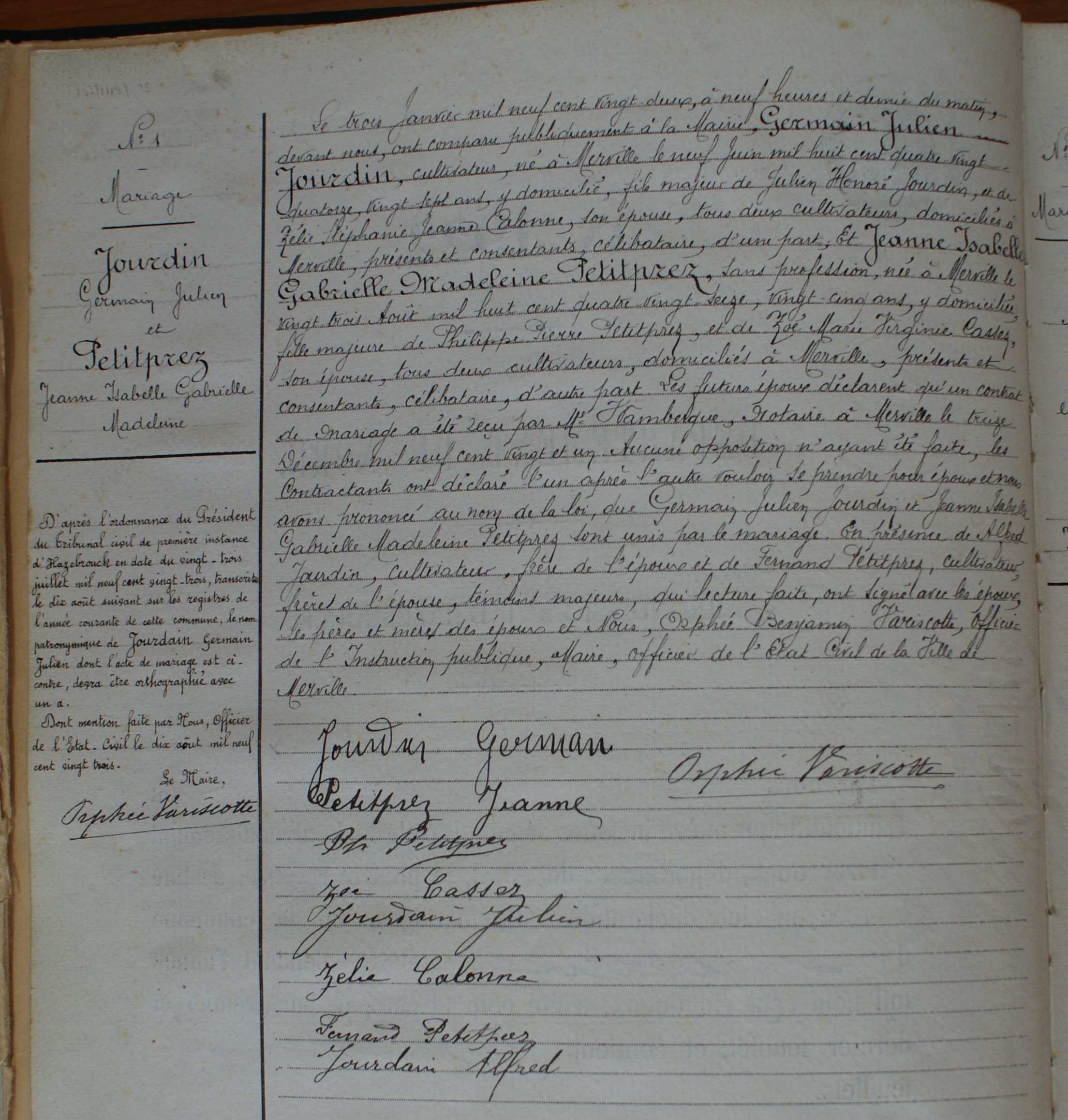 Acte de mariage de Germain Julien JOURDAIN + Jeanne Isabelle Gabrielle Madeleine PETITPREZ Age au mariage Lui : 27 ans et 7 mois - Elle : 25 ans et 5 mois. ID Famille F000767 Feuille familiale | Tableau familial