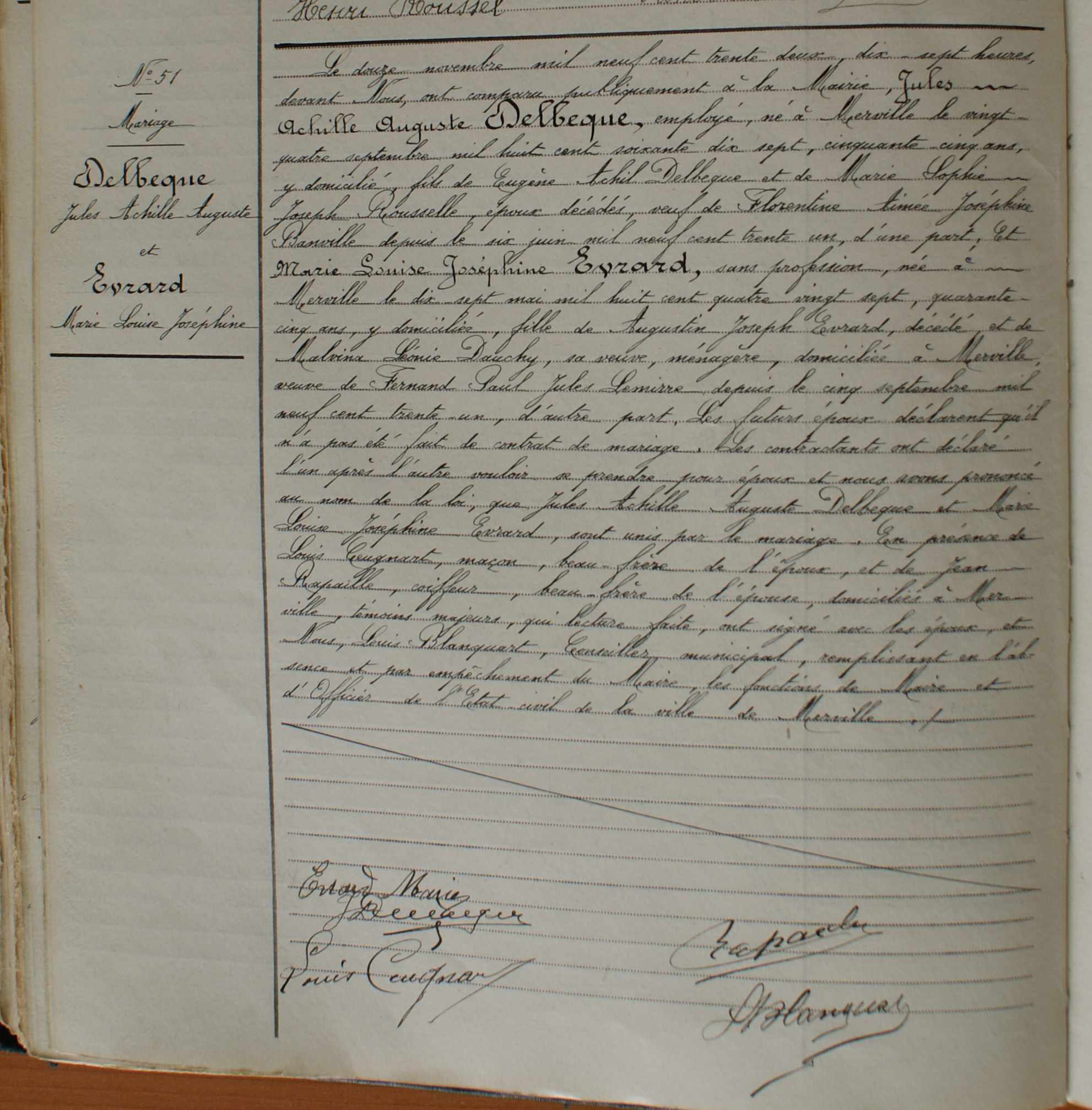 Acte de mariage de Jules Achille Auguste DELBECQUE + Marie Louise Josephine EVRARD Age au mariage Elle : 45 ans et 6 mois - Lui : 55 ans et 2 mois. ID Famille F008477 Feuille familiale | Tableau familial