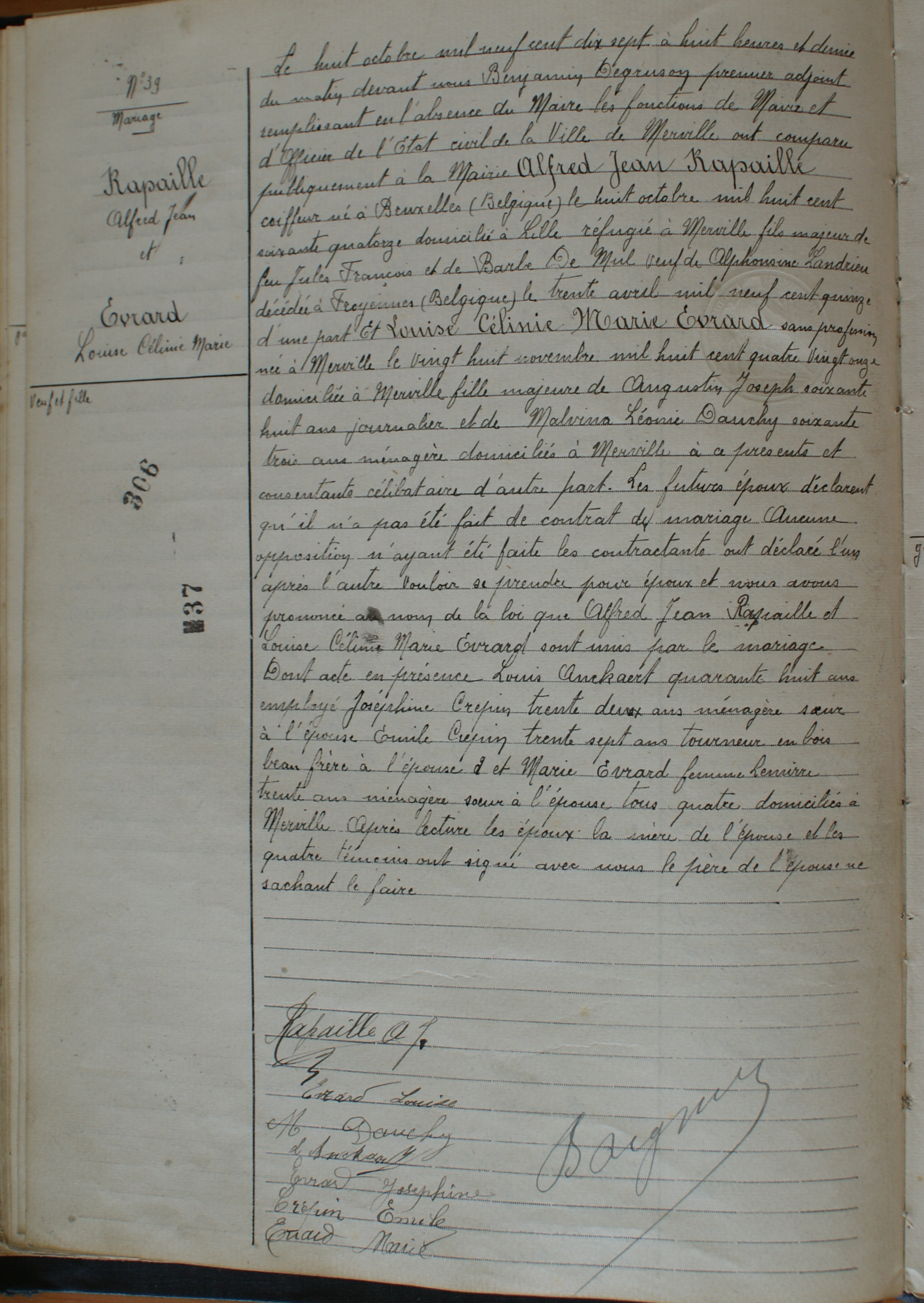 Acte de mariage de Alfred Jean RAPAILLE + Louise Célinie Marie EVRARD Age au mariage Elle : 25 ans et 11 mois - Lui : 43 ans. ID Famille F008475 Feuille familiale | Tableau familial