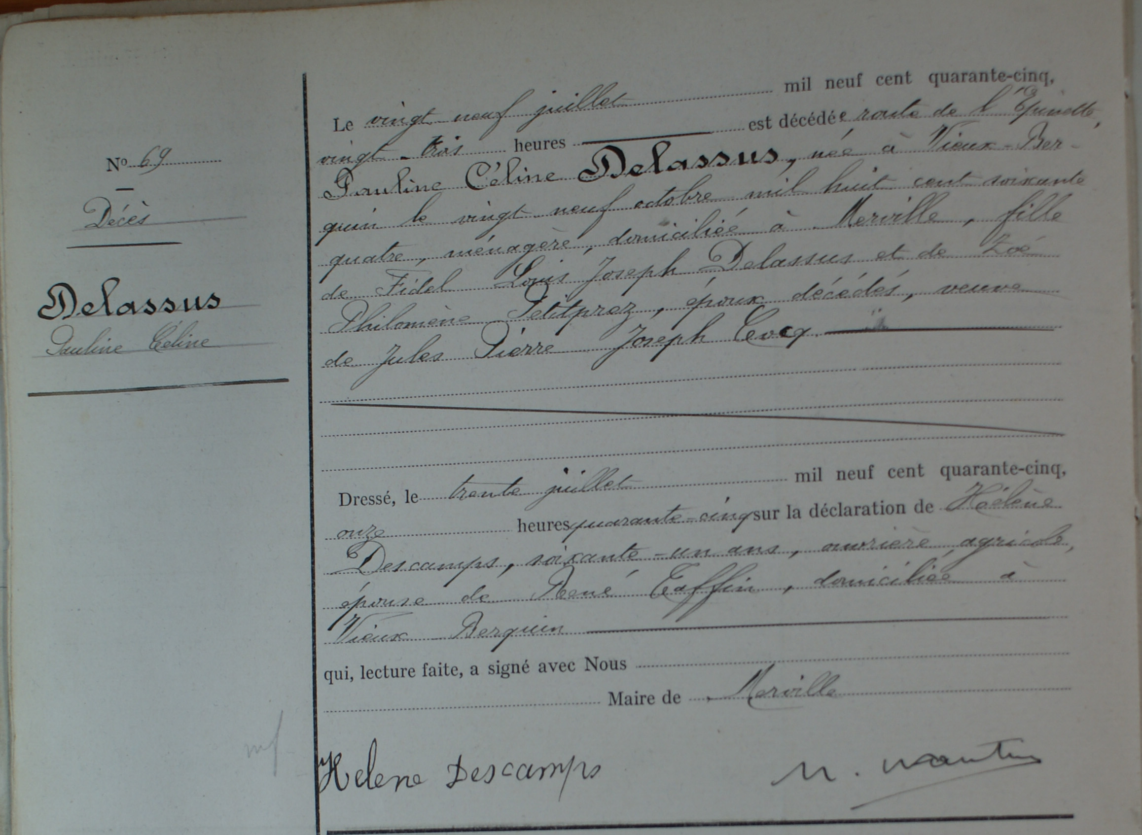 Acte de décès de Pauline Céline DELASSUS Inhumation Merville, 59660, Nord, Hauts-de-France, France