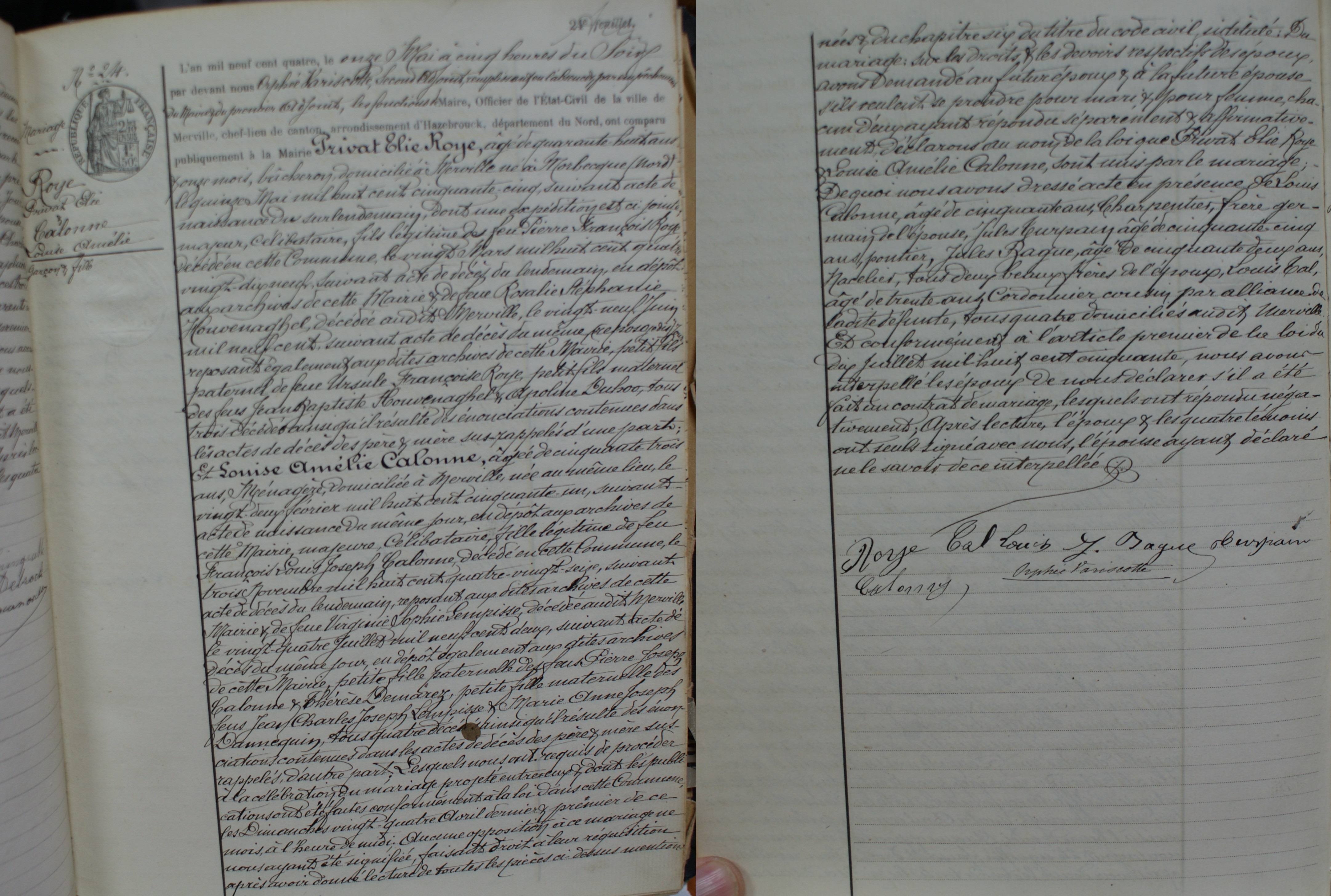 Acte de mariage de Privat "Elie" ROYE + Louise Amélie CALONNE Age au mariage Lui : 49 ans - Elle : 53 ans et 3 mois. ID Famille F008792 Feuille familiale | Tableau familial