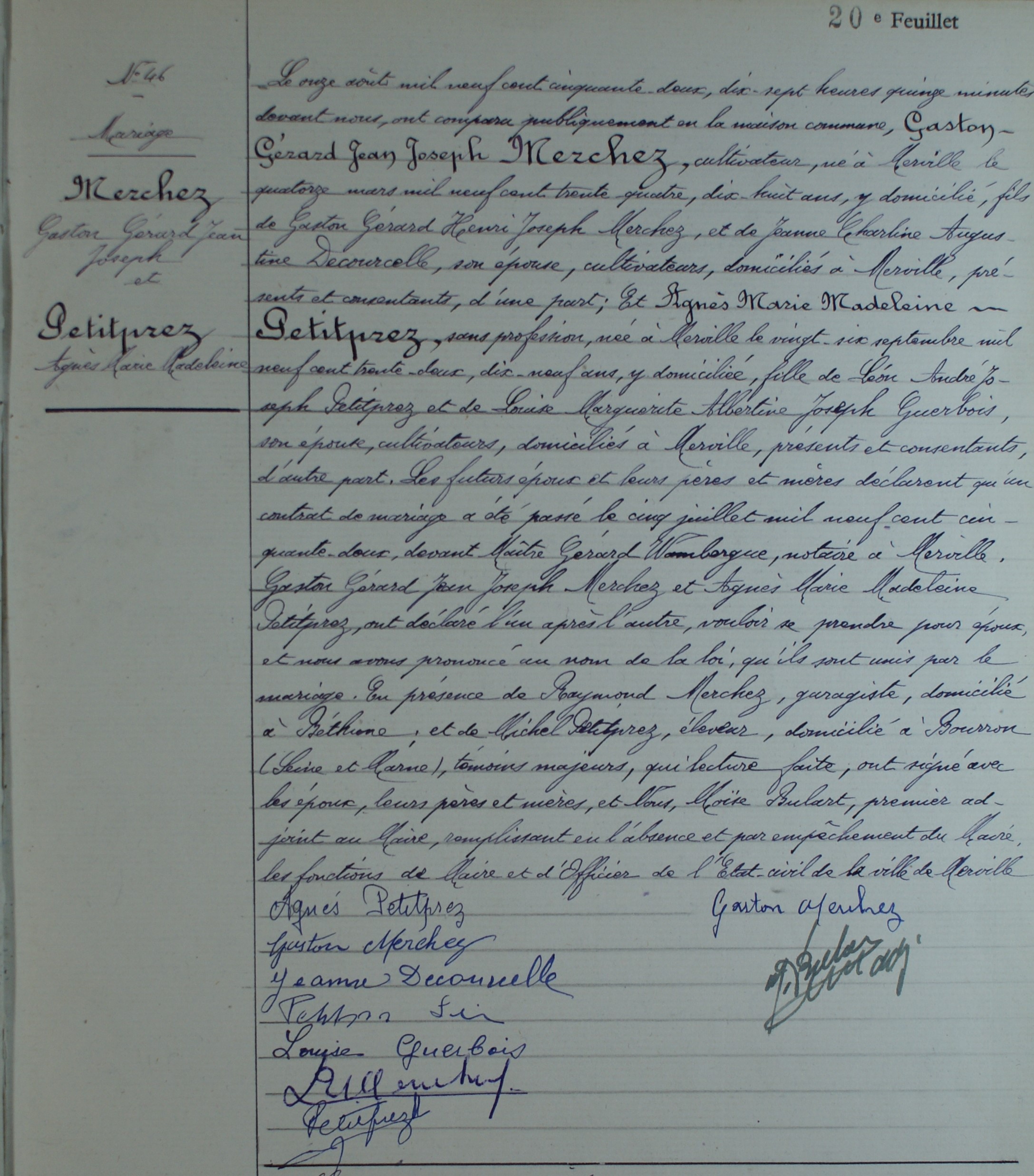 Acte de mariage de Gaston Gérard Jean Joseph MERCHEZ + Agnés Marie Madeleine PETITPREZ Age au mariage Elle : 19 ans et 11 mois - Lui : 18 ans et 5 mois. Enfants > 1. MERCHEZ E.M.A. ID Famille F008834 Feuille familiale | Tableau familial