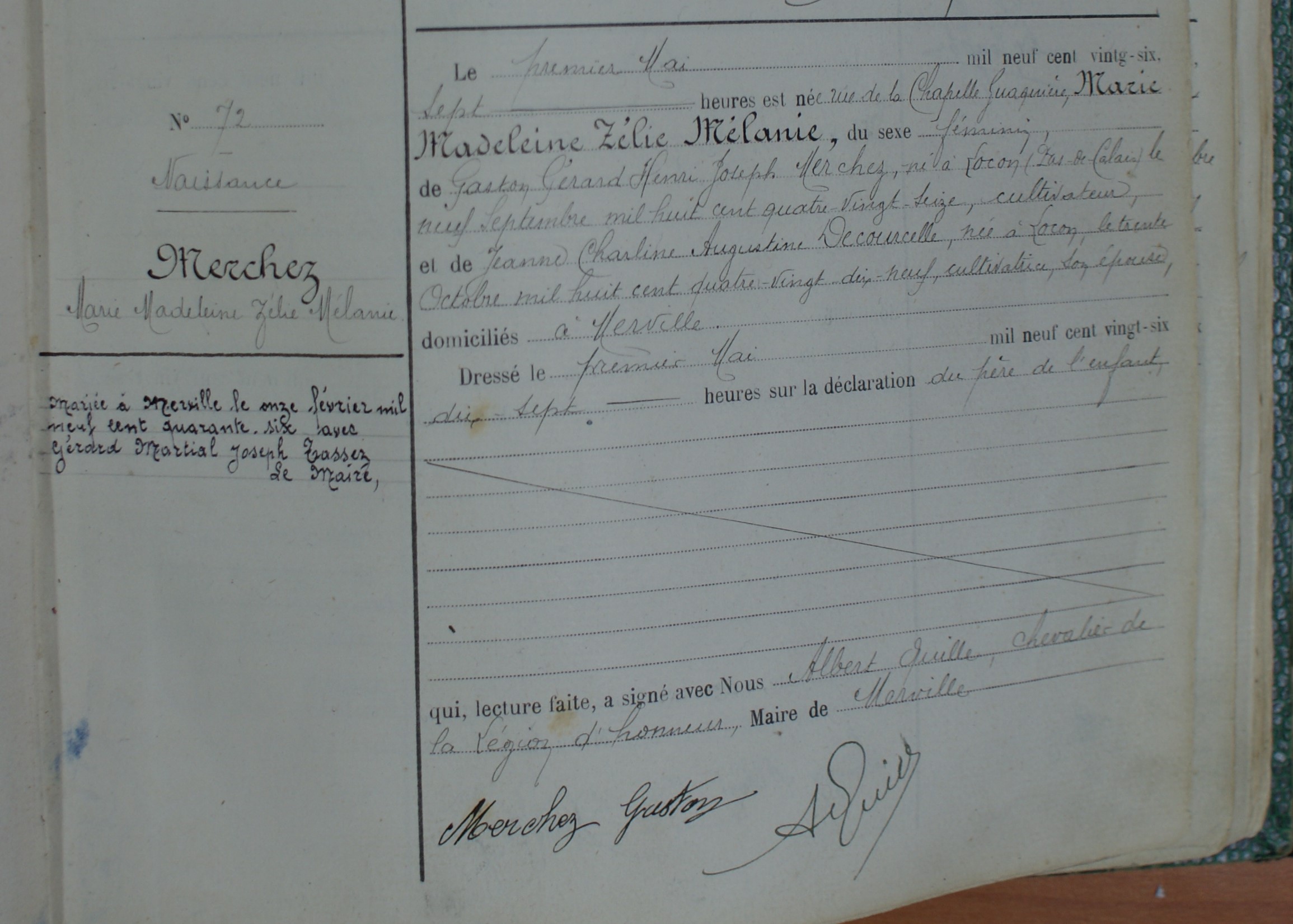 Acte de naissance de Marie Madeleine MERCHEZ Décès oui, date inconnue Patriarche & Matriarche
