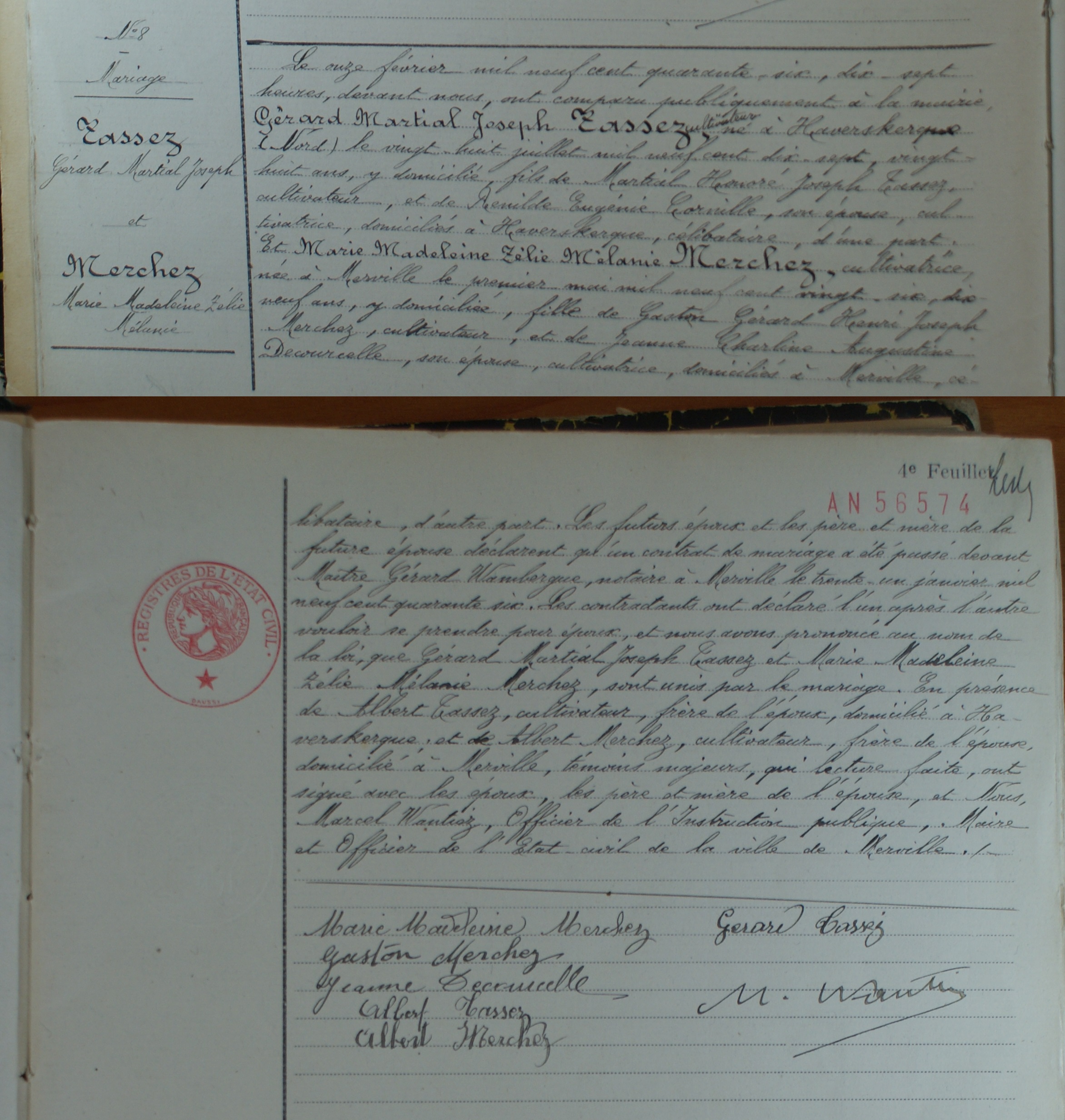 Acte de mariage de Gérard Martial Joseph TASSEZ + Marie Madeleine MERCHEZ Age au mariage Elle : 19 ans et 9 mois - Lui : 28 ans et 7 mois. ID Famille F008837 Feuille familiale | Tableau familial