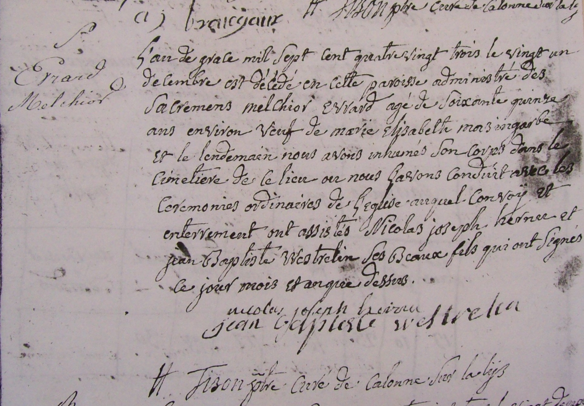 Acte de baptême de Melchior EVRARD Décès Dimanche 21 déc 1783 Calonne-sur-la-Lys, 62350, Pas-de-Calais, Hauts-de-France, France