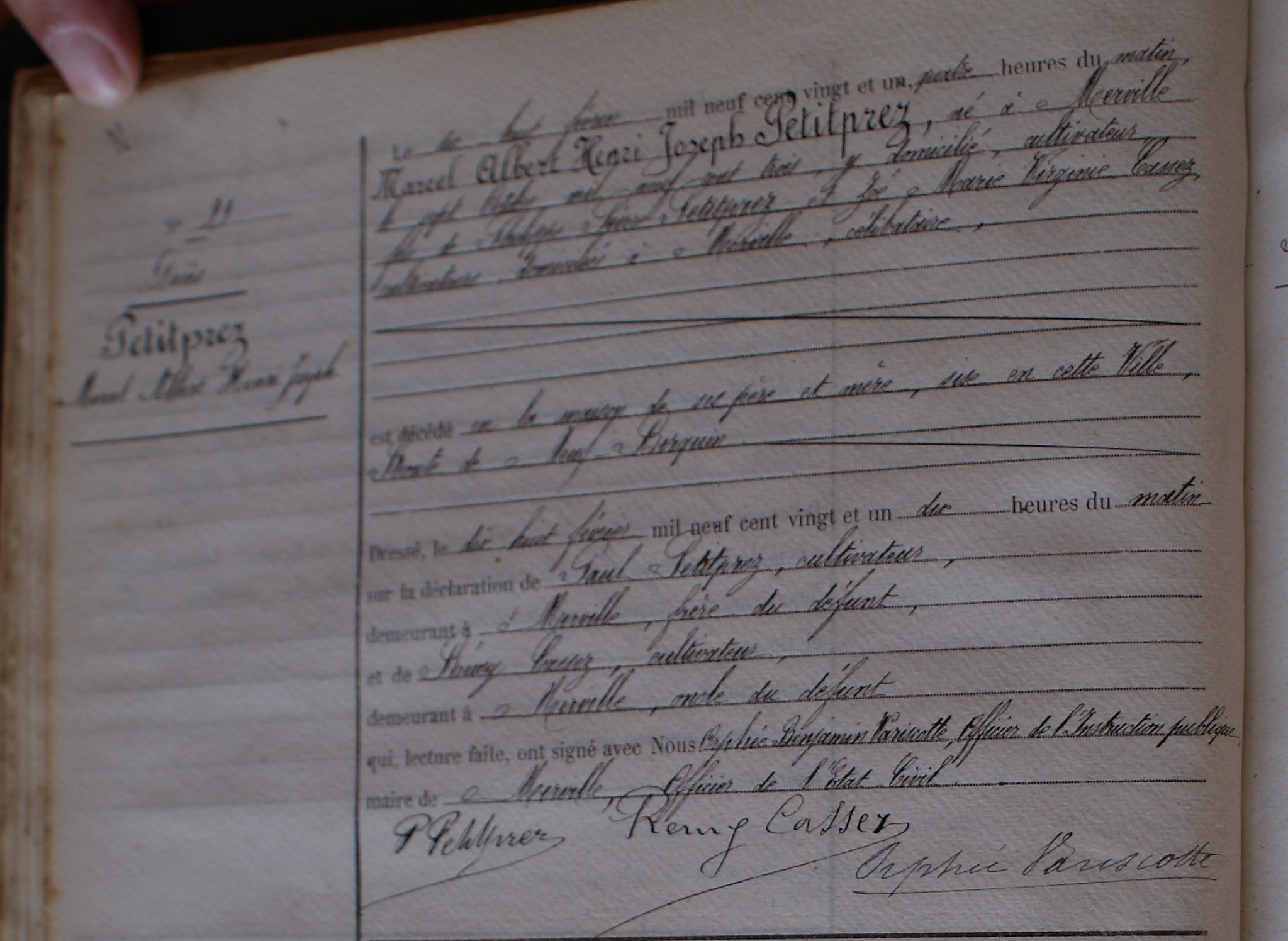 Acte de naissance de Marcel Albert Henri Joseph PETITPREZ Profession Cultivateur Décès Vendredi 18 fév 1921 Merville, 59660, Nord, Hauts-de-France, France