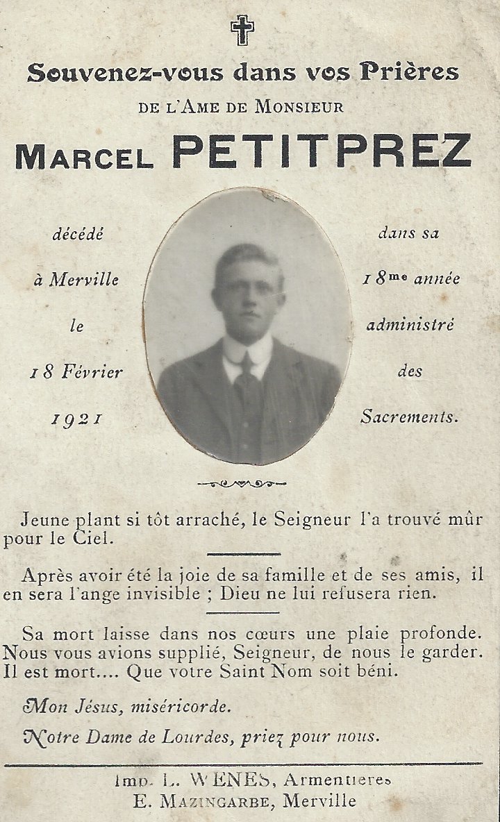 (Âgé de 78 ans)3. Père PETITPREZ Joseph, n. Lundi 23 mars 1885, Merville, 59660, Nord, Hauts-de-France, France