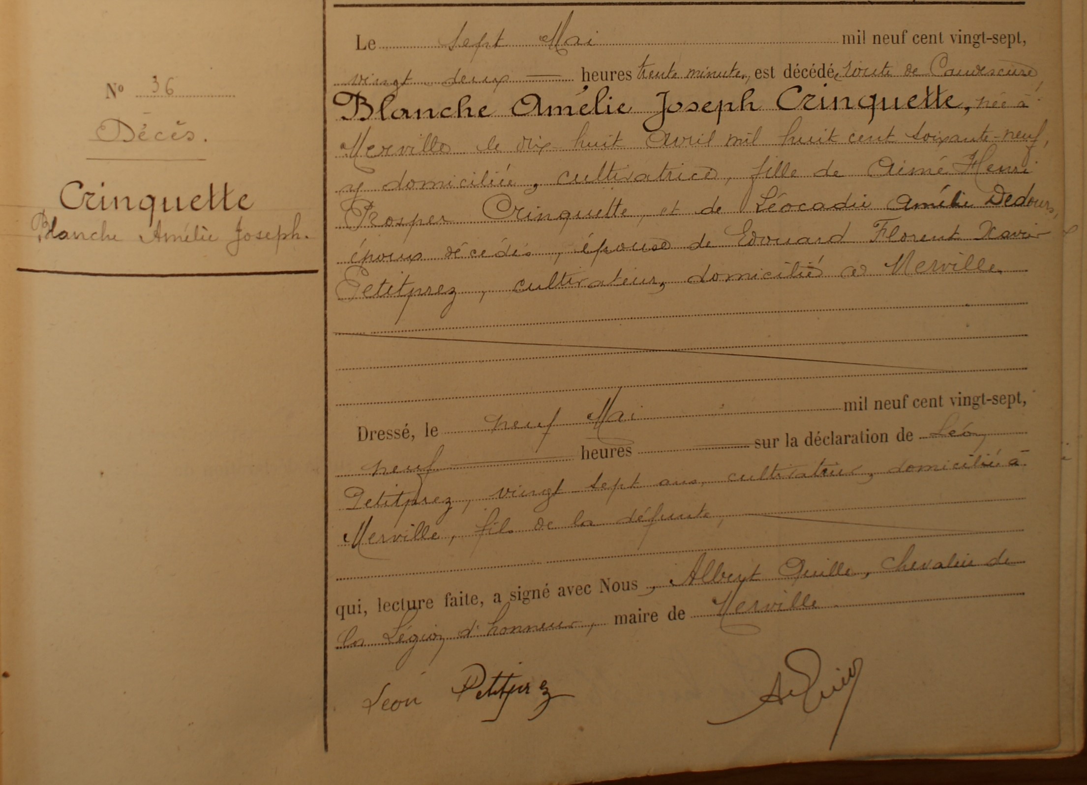 Acte de naissance de Blanche CRINQUETTE Décès Samedi 07 mai 1927 Merville, 59660, Nord, Hauts-de-France, France