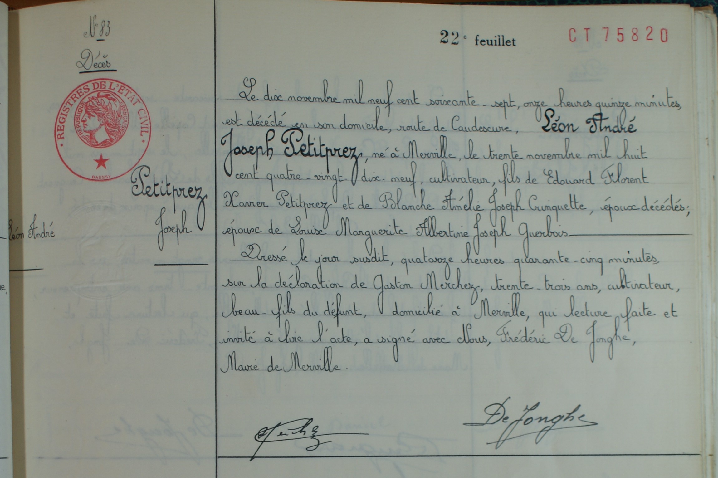 Acte de naissance de Léon André Joseph PETITPREZ Profession Cultivateur Décès Vendredi 10 nov 1967 Merville, 59660, Nord, Hauts-de-France, France
