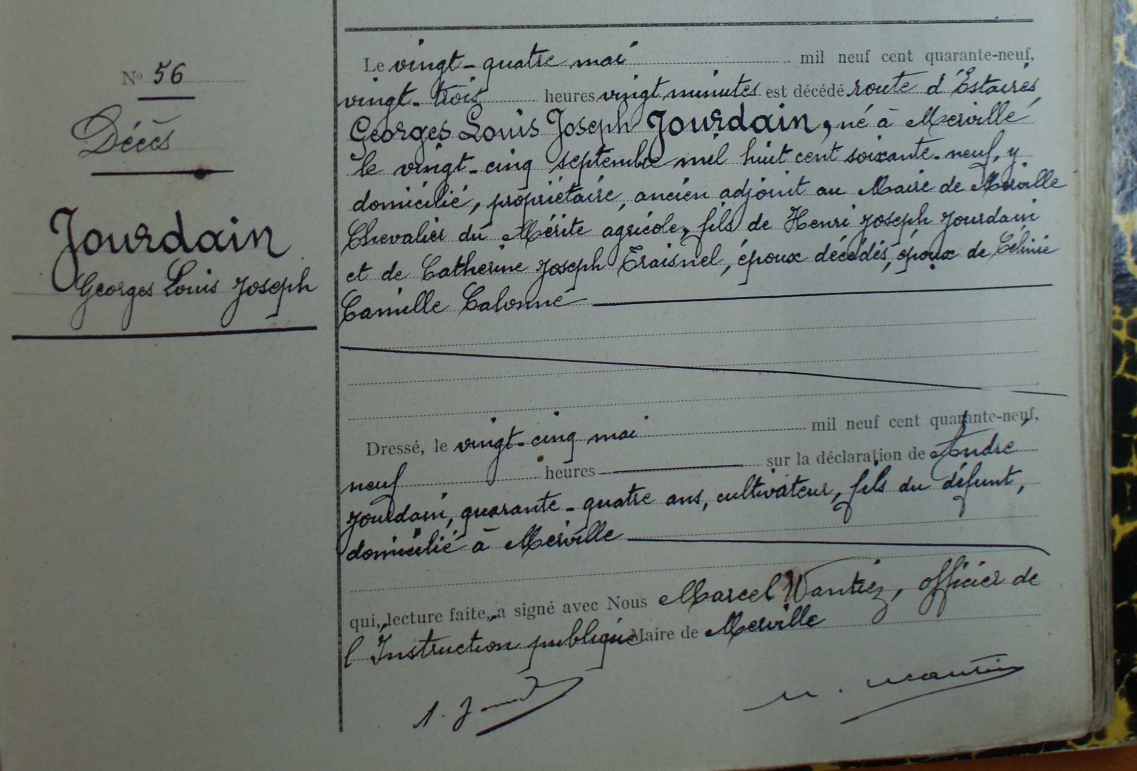 Acte de naissance de Georges Louis Joseph JOURDAIN Profession Cultivateur Décès Mardi 24 mai 1949 Merville, 59660, Nord, Hauts-de-France, France