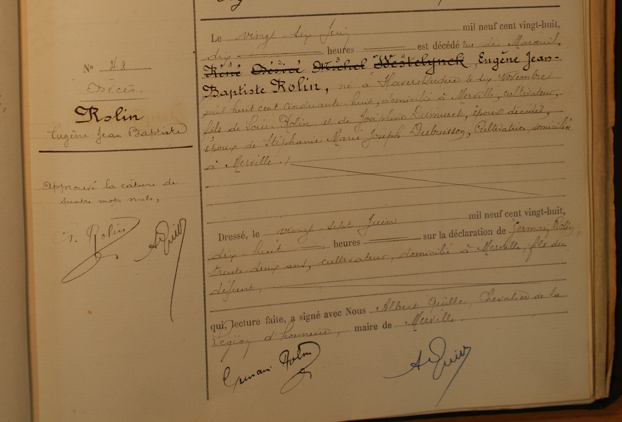Acte de naissance d' Eugène Jean Baptiste ROLIN Décès Mardi 26 juin 1928 Merville, 59660, Nord, Hauts-de-France, France