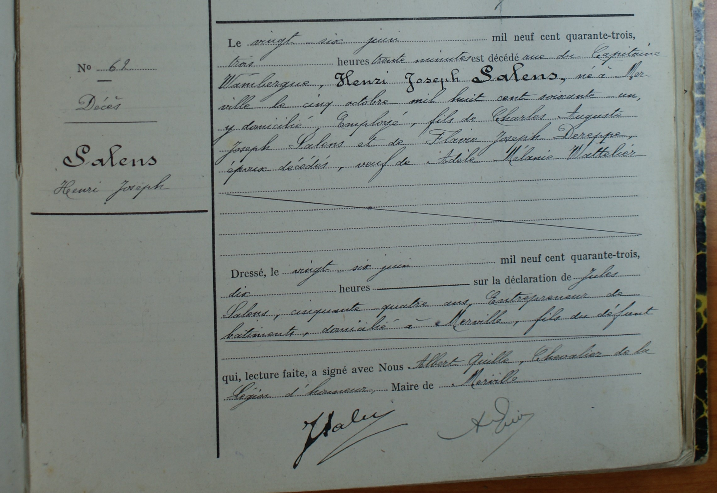Acte de décès de Henri Joseph SALENS Patriarche & Matriarche