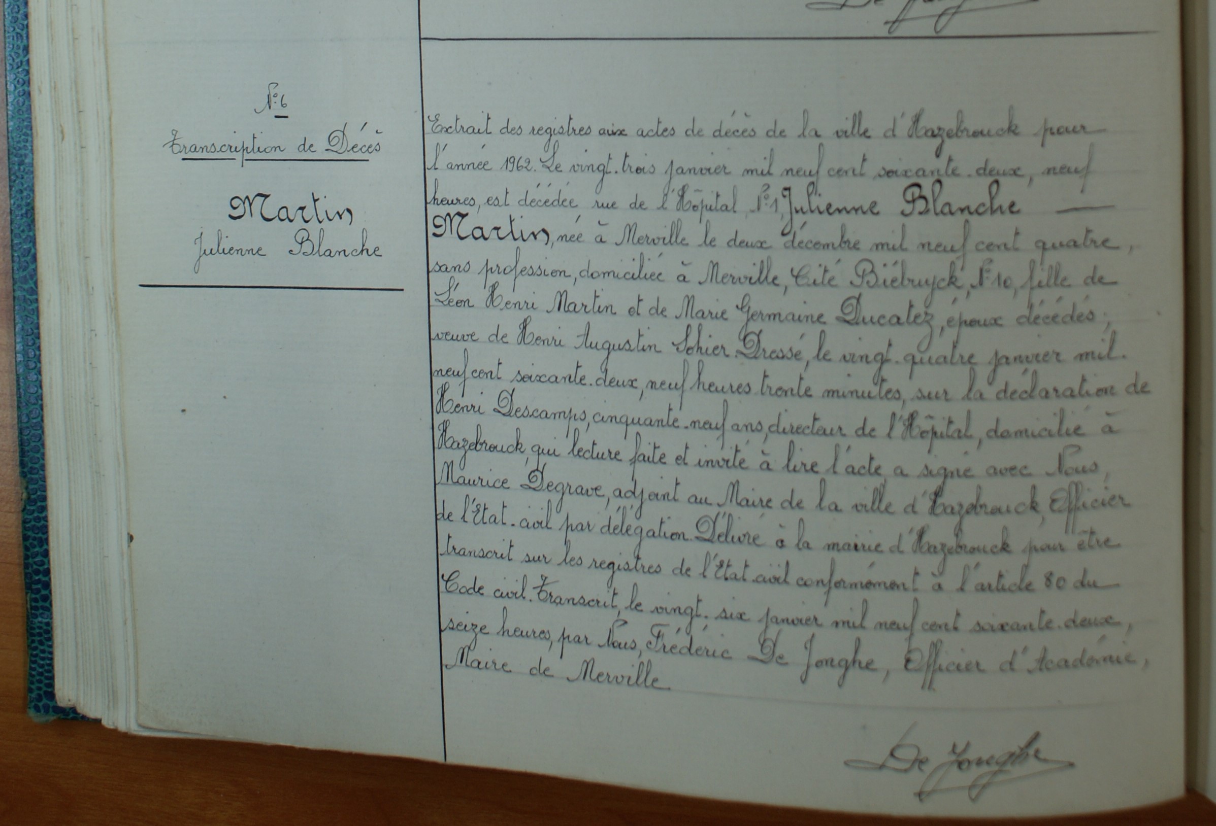 rue de l'hôpital n°1 Acte de décès de Julienne Blanche MARTIN ID personne I28101 Dernière modif. Vendredi 09 mars 2018