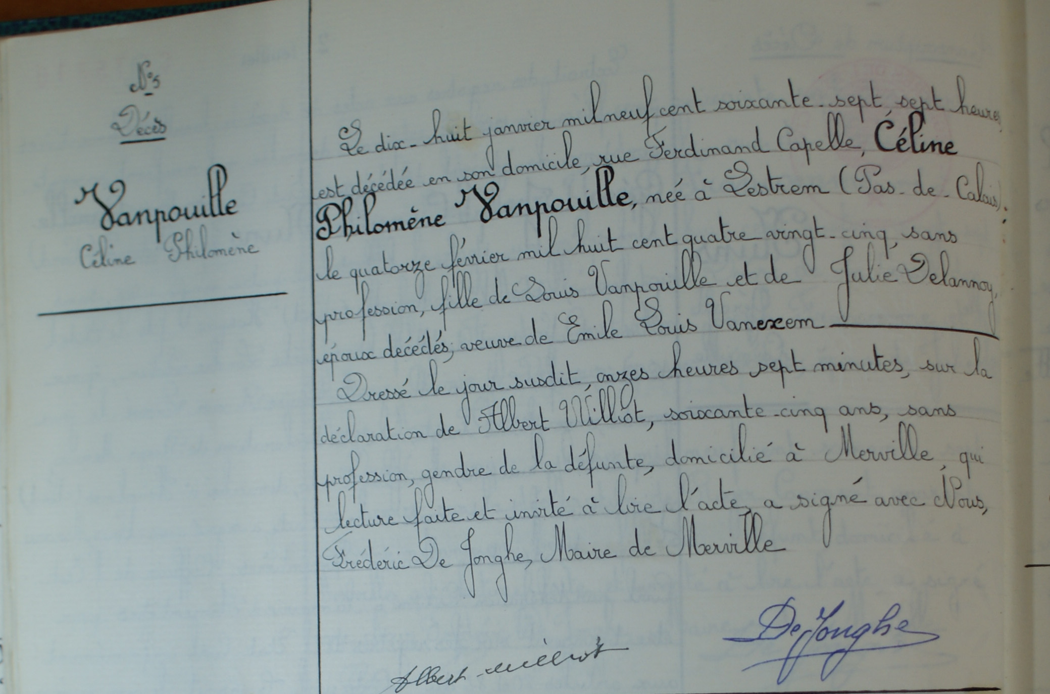 Acte de décès de Céline Philomène VANPOUILLE Inhumation Merville, 59660, Nord, Hauts-de-France, France