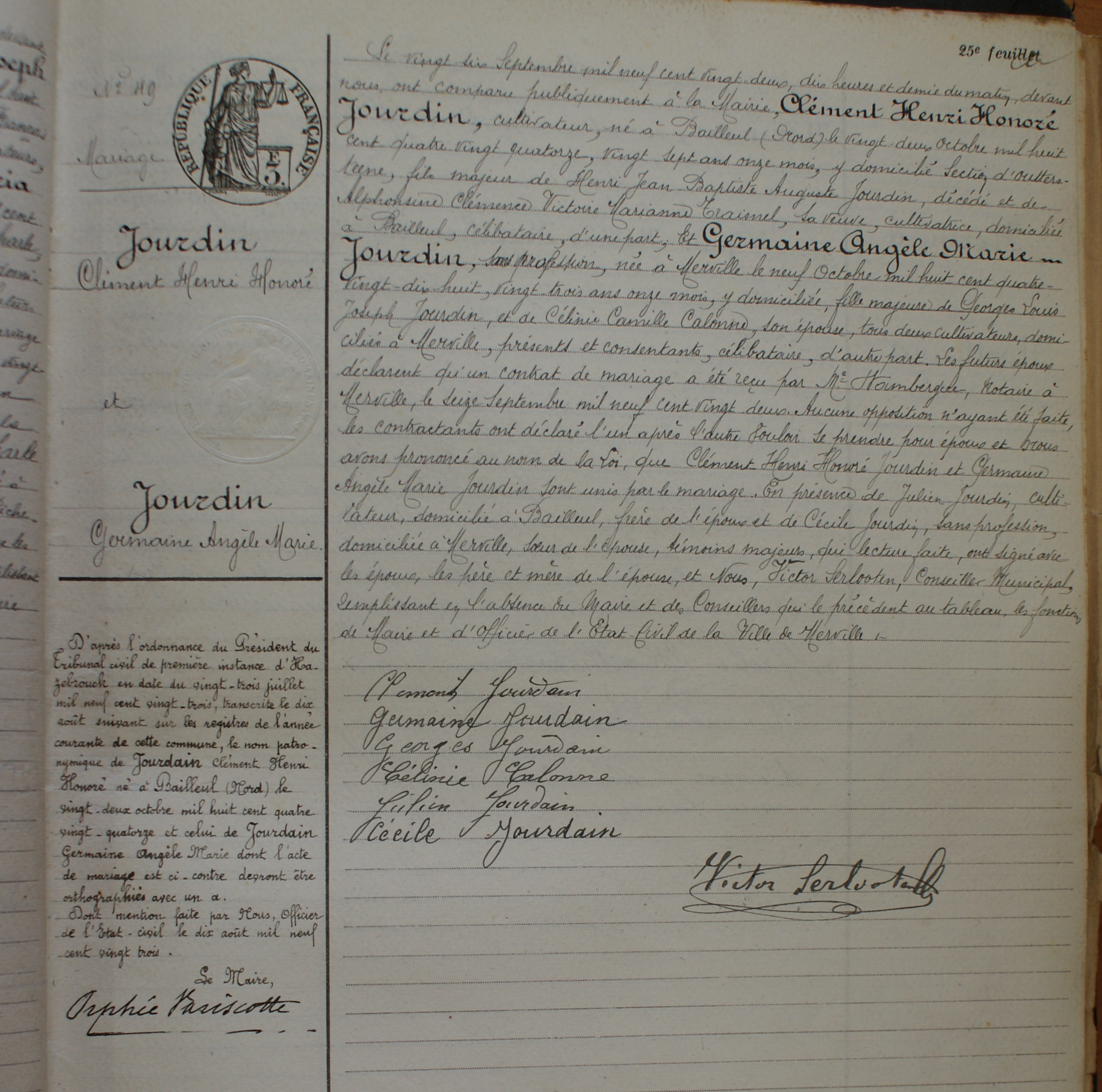 Acte de mariage de Clément Henri Honoré JOURDAIN + Germaine Angéle Marie JOURDAIN Age au mariage Elle : 23 ans et 11 mois - Lui : 27 ans et 11 mois. Enfants + 1. JOURDAIN Marie Therese Aline Clémentine, n. Vendredi 17 juin 1927, Merville, 59660, Nord, Hauts-de-France, France