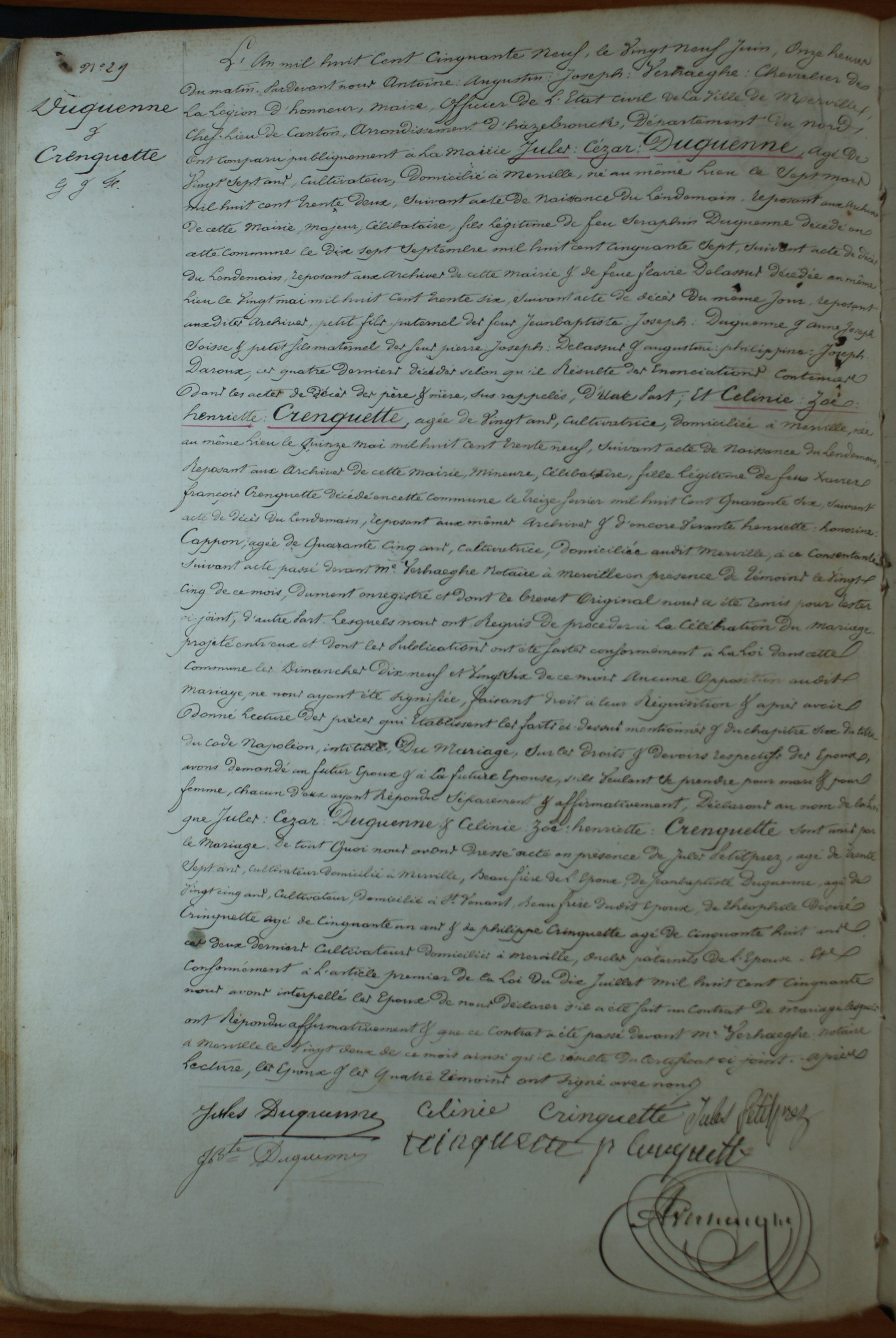 Acte de mariage de Jules César DUQUENNE + Célinie Zoé Henriette CRINQUETTE Age au mariage Lui : 27 ans et 3 mois - Elle : 20 ans et 1 mois. ID Famille F006544 Feuille familiale | Tableau familial