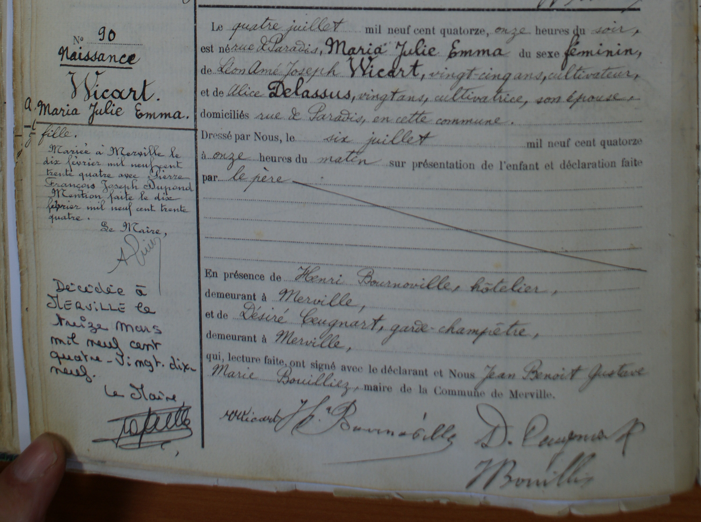 Acte de naissance de Maria Julie Emma WICART Décès Samedi 13 mars 1999 Merville, 59660, Nord, Hauts-de-France, France