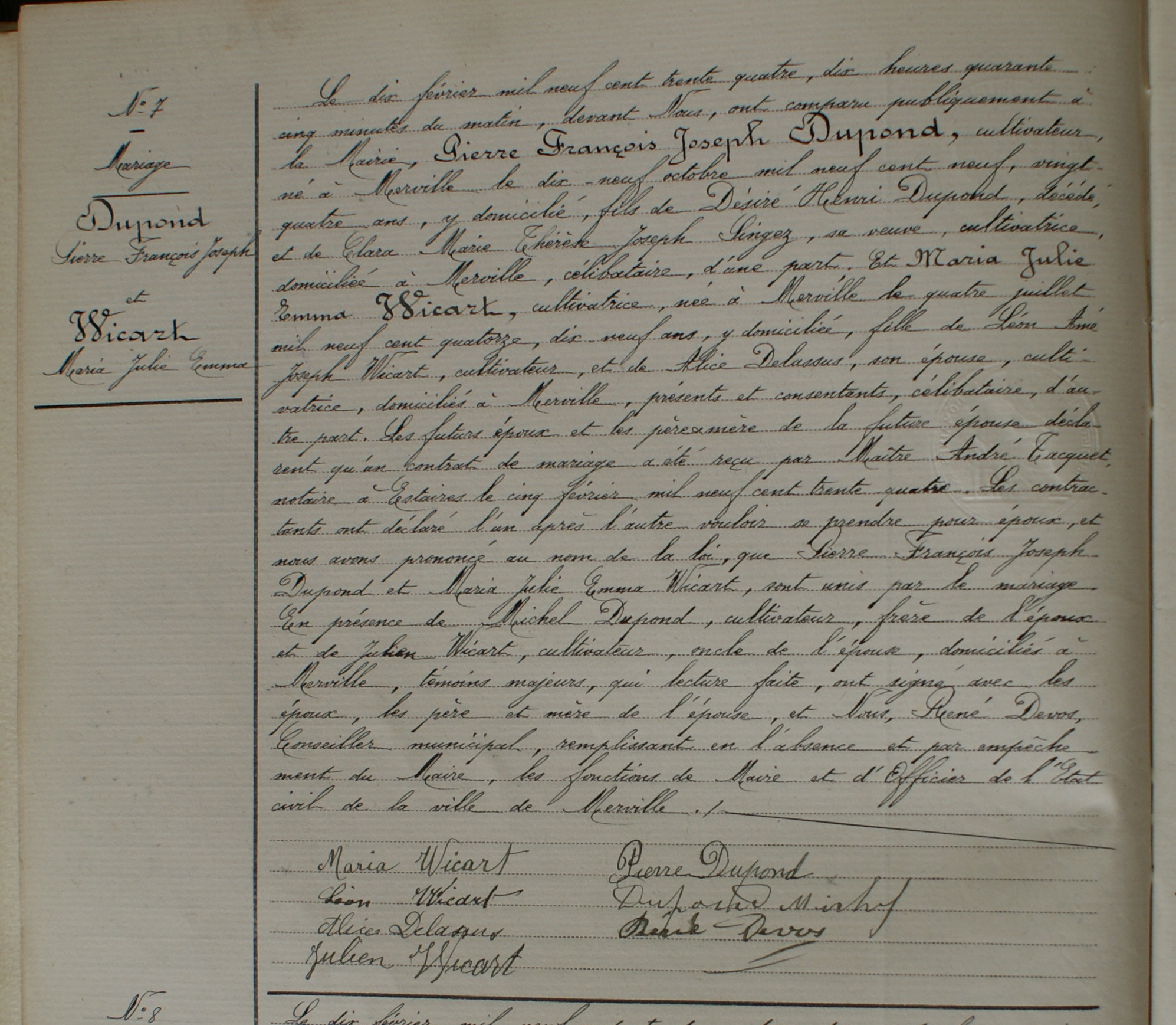 Acte de mariage de Pierre François Joseph DUPOND + Maria Julie Emma WICART Age au mariage Elle : 19 ans et 7 mois - Lui : 24 ans et 4 mois. Enfants + 1. DUPOND F.M.J. ID Famille F010326 Feuille familiale | Tableau familial