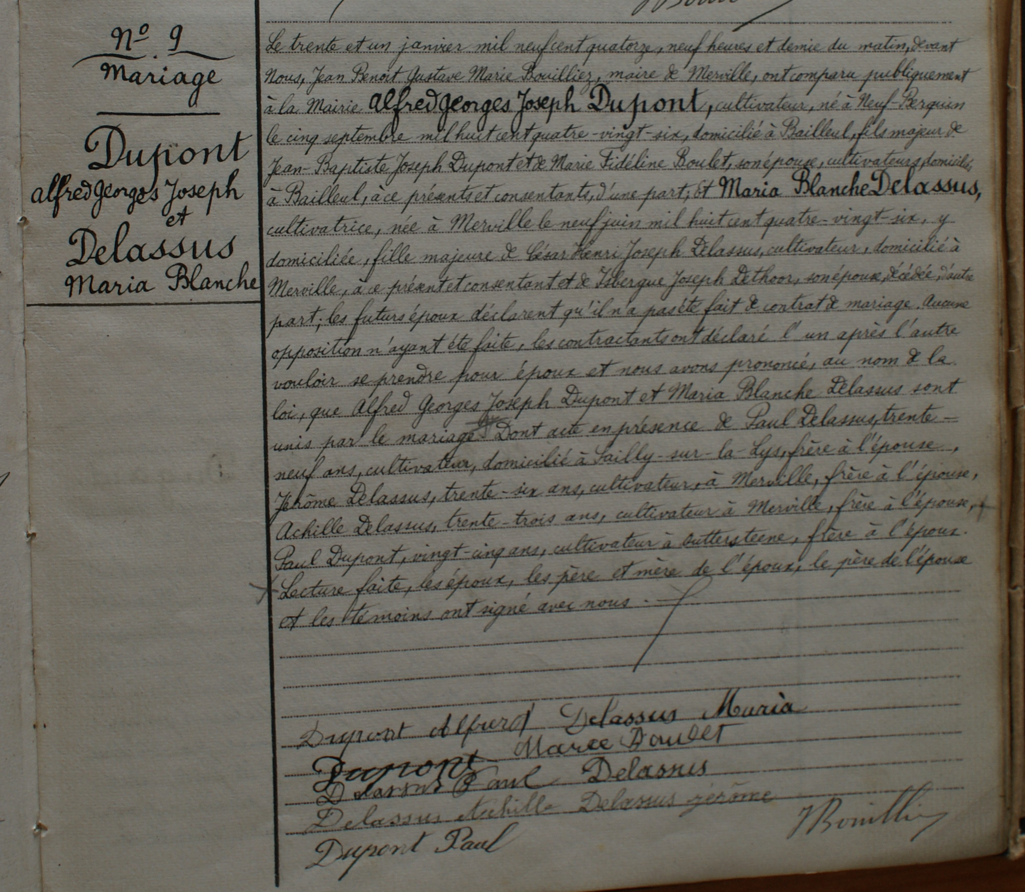 Acte de mariage de Alfred Georges Joseph DUPONT + Maria Blanche DELASSUS Age au mariage Lui : 27 ans et 4 mois - Elle : 27 ans et 7 mois. Enfants > 1. DUPONT Léa Hélène Marie, n. Samedi 03 fév 1917, Merville, 59660, Nord, Hauts-de-France, France