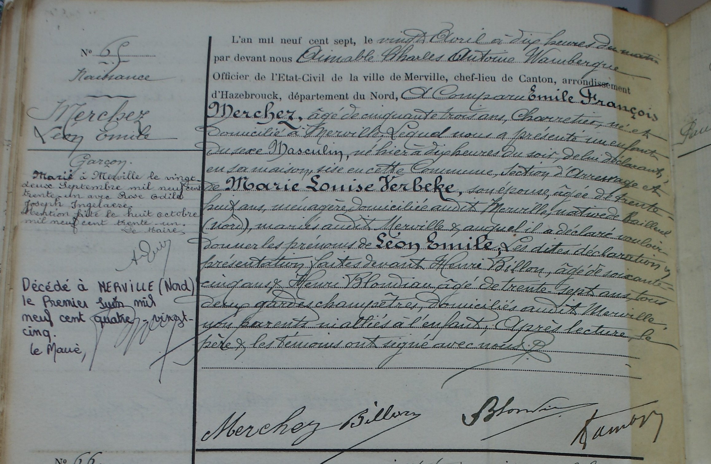 Acte de naissance de Léon Emile MERCHEZ Profession Ouvrier agricole Décès Samedi 01 juin 1985 Merville, 59660, Nord, Hauts-de-France, France
