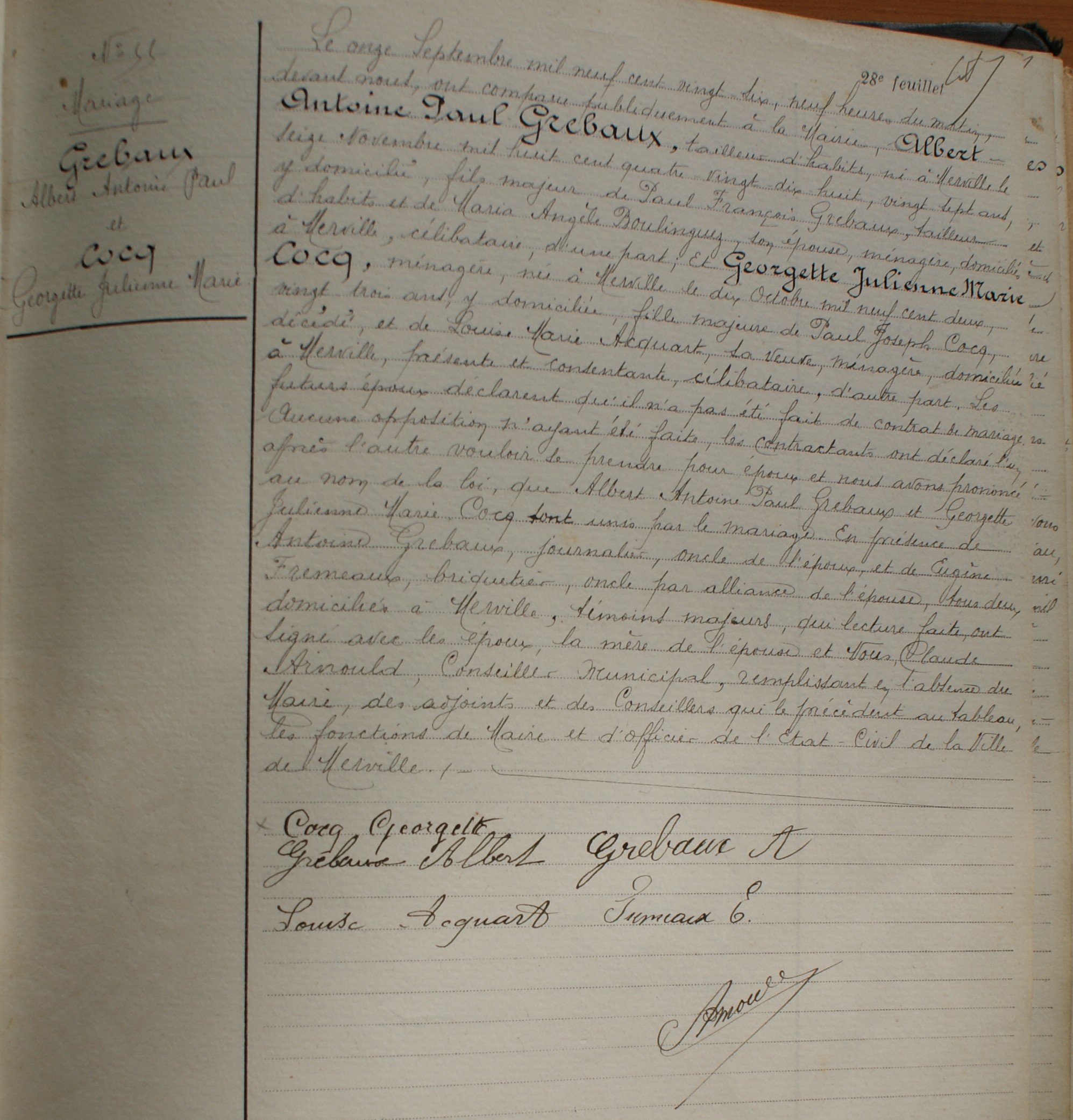 Acte de mariage de Albert Antoine Paul GREBAUX + Georgette Julienne COCQ Age au mariage Lui : 27 ans et 10 mois - Elle : 23 ans et 11 mois. Enfants + 1. GREBAUX G.L.M. ID Famille F010530 Feuille familiale | Tableau familial