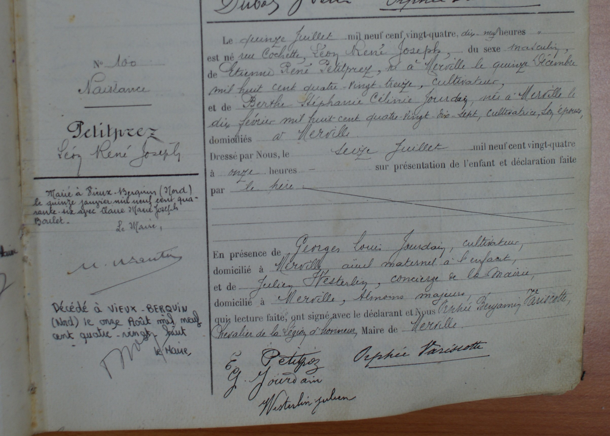 rue CochetteActe de naissance de Léon René Joseph PETITPREZ Décès Jeudi 11 août 1988 Vieux-Berquin, 59232, Nord, Hauts-de-France, France