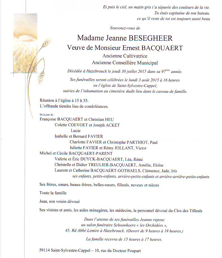 Faire part de décès de Jeanne BESEGHEER-BACQUAERT Inhumation Lundi 03 août 2015 Saint-Sylvestre-Cappel, 59114, Nord, Hauts-de-France, France