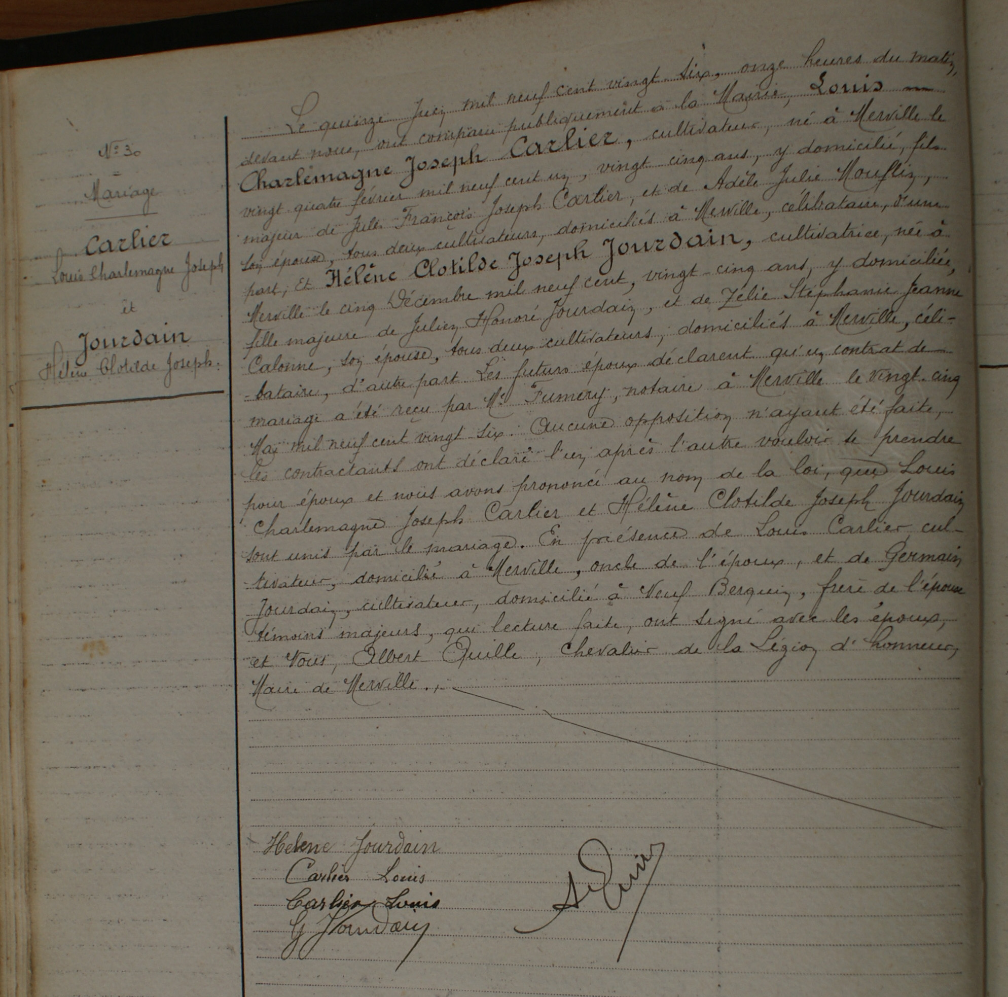 Acte de mariage de Louis Charlemagne CARLIER + Hélène Clotilde Joseph JOURDAIN Age au mariage Lui : 25 ans et 4 mois - Elle : 25 ans et 6 mois. ID Famille F010320 Feuille familiale | Tableau familial