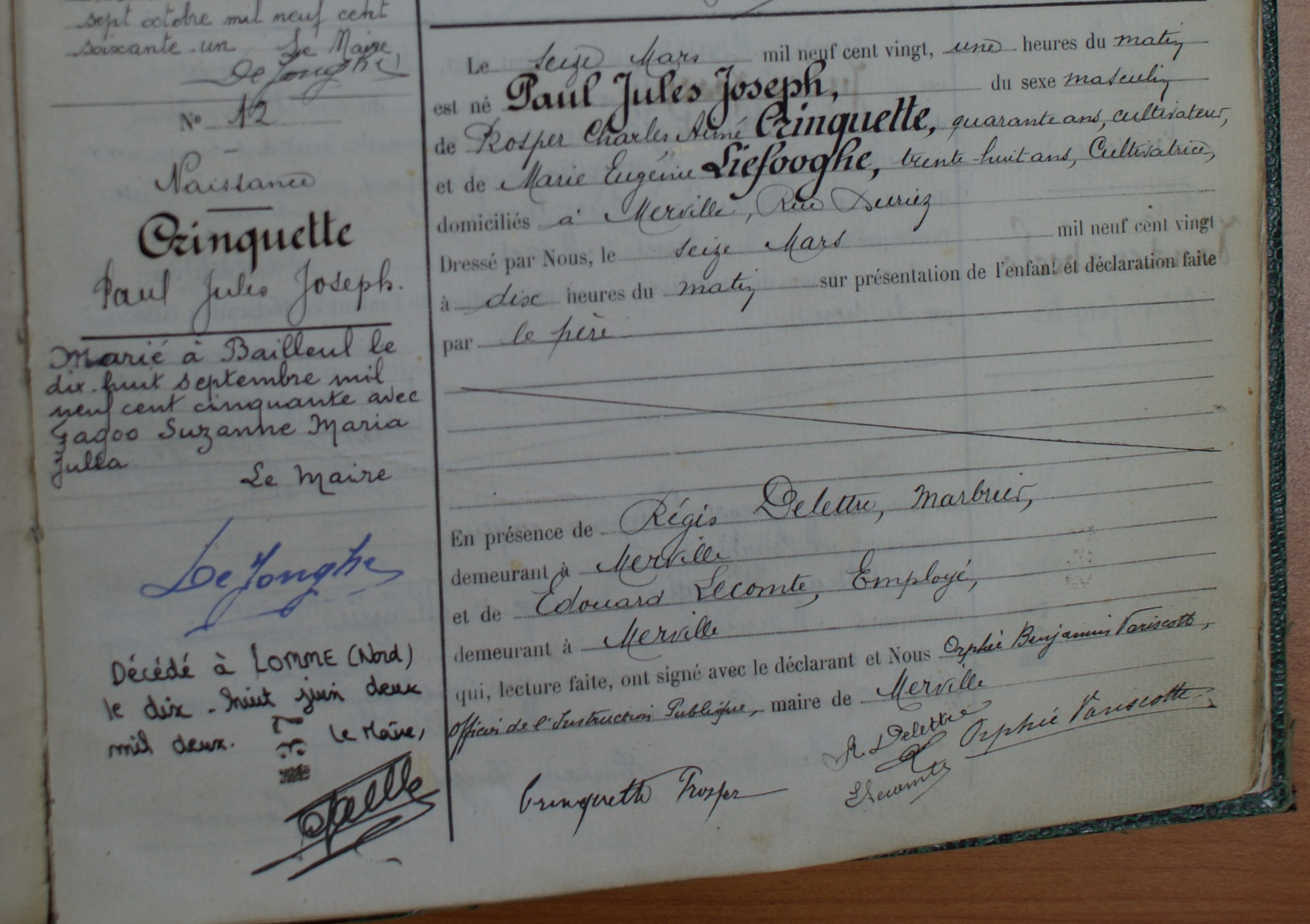 Acte de naissance de Paul Jules Joseph CRINQUETTE DécèsMardi 18 juin 2002 Lomme, 59160, Nord, Hauts-de-France, France